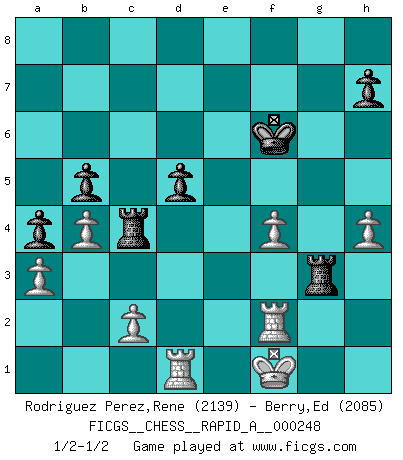 Last move : 1/2-1/2 2020 March 8 18:20:39 [Event "FICGS__CHESS__RAPID_A__000248"] [Site "FICGS"] [Date "2019.11.16"] [Round "1"] [White "Rodriguez Perez,Rene"] [Black "Berry,Ed"] [Result "1/2-1/2"] [WhiteElo "2139"] [BlackElo "2085"] 1.e4 c5 2.Nf3 d6 3.d4 cxd4 4.Qxd4 Nc6 5.Bb5 Bd7 6.Bxc6 Bxc6 7.Nc3 Nf6 8.Be3 g6 9.O-O Bg7 10.Qd3 O-O 11.Rad1 Qc7 12.Nd4 Rac8 13.f4 Rfe8 14.h3 Nd7 15.f5 Qb6 16.Nb3 Qc7 17.Nd4 Qb6 18.b3 Qa5 19.Nxc6 Rxc6 20.Nd5 e6 21.fxe6 fxe6 22.Nf4 Ne5 23.Qd2 Qxd2 24.Rxd2 Nd7 25.Nd3 Nf6 26.Nf2 b5 27.Rfd1 d5 28.Bd4 Re7 29.exd5 exd5 30.Nd3 a5 31.Nf4 Re4 32.g3 g5 33.Bxf6 gxf4 34.Bxg7 Kxg7 35.gxf4 Kf6 36.Kg2 Re3 37.h4 R6c3 38.Rf2 Rg3+ 39.Kf1 Rc5 40.a3 a4 41.b4 Rc4 1/2-1/2 Sicilian, Chekhover variation Kingside Castling by player White (move 9) Kingside Castling by player Black (move 10) This chess game ended in a draw. Follow this game move after move (download)Suddenly it was obvious to me in my analysis I had missed what Fischer had found with the greatest of ease at the board. (Mikhail Botvinnik) Es hat in meinem Leben Zeiten gegeben, in denen das Schachspiel, wenn nicht zum Lebenszweck, so doch zu einem regelrechten Lebensersatz geworden ist. Man fühlt sich in solchen Zeiten nicht so, als besäße man eine göttliche Gabe, sondern eher so, als sei man von ihr besessen. (Garry Kasparov) Si tu oponente te ofrece un empate, trata de averiguar porque piensa él que esta en una posición peor. (Nigel Short) La tactique est l'élément le plus important du milieu de jeu. (Siegbert Tarrasch) A belief is an idea the mind possesses, an idea that possesses the mind. (Robert Oxden Bolton)