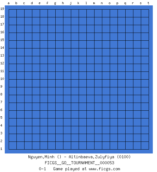 Last move : 0-1 2019 December 18 7:46:37 [Event "FICGS__GO__TOURNAMENT__000053"] [Site "FICGS"] [Date "2019.11.17"] [Round "1"] [Black "Nguyen,Minh"] [White "Altinbaeva,Zulyfiya"] [Result "0-1"] [Rating 2 "0100"] 0-1 This go game has been lost on time (started : 2019.11.17 14:21:43) Here are the names of the openings (joseki) played in the four corners : Player White won this Go (weiqi, baduk) game. Follow this game move after move (download)Corner, side, centre. (Anonymous) The message for business people contemplating their place in the cyberspace is simple and direct: get linked or get lost. (Vic Sussman and Kenan Pollack)