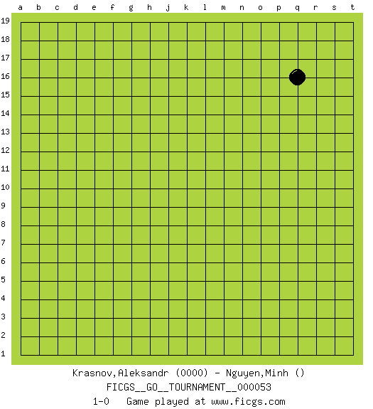 Last move : 1-0 2019 December 18 7:46:37 [Event "FICGS__GO__TOURNAMENT__000053"] [Site "FICGS"] [Date "2019.11.17"] [Round "1"] [Black "Krasnov,Aleksandr"] [White "Nguyen,Minh"] [Result "1-0"] [Rating 1 "0000"] 1.q16 1-0 This go game has been lost on time (started : 2019.11.17 14:21:43) Here are the names of the openings (joseki) played in the four corners : Player Black won this Go (weiqi, baduk) game. Follow this game move after move (download)The possibility or impossibility of an event results logically from the rules. (Pierre Audouard) Always be a first-rate version of yourself, instead of a second-rate version of somebody else. (Judy Garland)