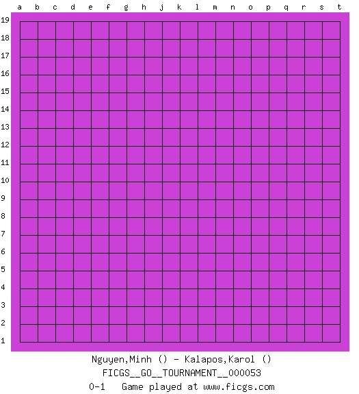 Last move : 0-1 2019 December 18 7:46:37 [Event "FICGS__GO__TOURNAMENT__000053"] [Site "FICGS"] [Date "2019.11.17"] [Round "1"] [Black "Nguyen,Minh"] [White "Kalapos,Karol"] [Result "0-1"] 0-1 This go game has been lost on time (started : 2019.11.17 14:21:43) Here are the names of the openings (joseki) played in the four corners : Player White won this Go (weiqi, baduk) game. Follow this game move after move (download)Everything would seem to be possible in Go. Like pulling a rabbit, by a magical move, out of a hat. (Pierre Audouard) Quotation,n.: The act of repeating erroneously the words of another. The words erroneously repeated. (Ambrose Bierce, The Devil's Dictionary)