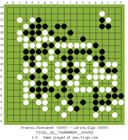 Last move : 1-0 2020 June 28 21:11:42 [Event "FICGS__GO__TOURNAMENT__000053"] [Site "FICGS"] [Date "2019.11.17"] [Round "1"] [Black "Krasnov,Aleksandr"] [White "Larina,Olga"] [Result "1-0"] [Rating 1 "0000"] [Rating 2 "0000"] 1.q16 d4 2.q4 d16 3.k16 k4 4.f17 d10 5.q10 e17 6.f15 d13 7.e14 f13 8.e16 c17 9.d15 c15 10.m3 d14 11.e15 g15 12.g16 g14 13.h15 h14 14.j14 j13 15.j16 m13 16.k14 k13 17.l15 m10 18.n14 m6 19.l5 g3 20.k3 j3 21.j5 l3 22.l4 k2 23.n4 o6 24.p6 p7 25.o7 o8 26.n7 n6 27.n8 p8 28.o9 q6 29.p5 m7 30.m9 r3 31.r4 q3 32.p3 p2 33.p4 n10 34.l8 m8 35.n9 p9 36.o10 q9 37.r9 p10 38.p11 o11 39.l10 l9 40.q12 g5 41.k9 k8 42.m9 l7 43.l9 j9 44.l12 l13 45.n12 k10 46.k11 j10 47.m12 n9 48.l11 j7 49.g12 g10 50.h13 h12 51.g13 f14 52.j12 h11 53.f12 e13 54.f16 f11 55.k6 n13 56.o12 o13 57.p13 r10 58.q11 r8 59.s9 s10 60.k7 j8 61.r7 s8 62.q7 r6 63.s6 s7 64.r5 q8 65.h6 s4 66.s5 t4 67.t5 s2 68.g8 h7 69.g7 e7 70.g6 g9 71.f5 g4 72.e6 d5 73.e8 d7 74.f7 d6 75.e10 e5 76.f6 f4 77.f9 d9 78.d8 c8 79.d11 e9 80.e12 f8 81.e8 f10 82.d12 c14 83.e11 r17 84.r16 q18 85.q17 1-0 This go game has been lost on time (started : 2019.11.17 14:21:43) Here are the names of the openings (joseki) played in the four corners : Corner d16 : d16 f17 Hoshi (Hwajeom, Seongjeom, Xingwei`) 4-4 Point. The star or hoshi (4-4) point, emphasizing influence at the potential expense of territory. Ikken Kakari (Hankan Keolch'im, Yi Gua`jiao~, 1-Space Low Approach). Black 2 is the standard approach move to the 4-4. Corner q16 : q16 m13 Hoshi (Hwajeom, Seongjeom, Xingwei`) 4-4 Point. The star or hoshi (4-4) point, emphasizing influence at the potential expense of territory. Player Black won this Go (weiqi, baduk) game. Follow this game move after move (download)While the Baroque rules of chess could only have been created by humans, the rules of go are so elegant, organic, and rigorously logical that if intelligent life forms exist elsewhere in the universe, they almost certainly play go. (Edward Lasker, international chess master) Wisdom is the reward you get for a lifetime of listening when you'd have preferred to talk. (Doug Larson)