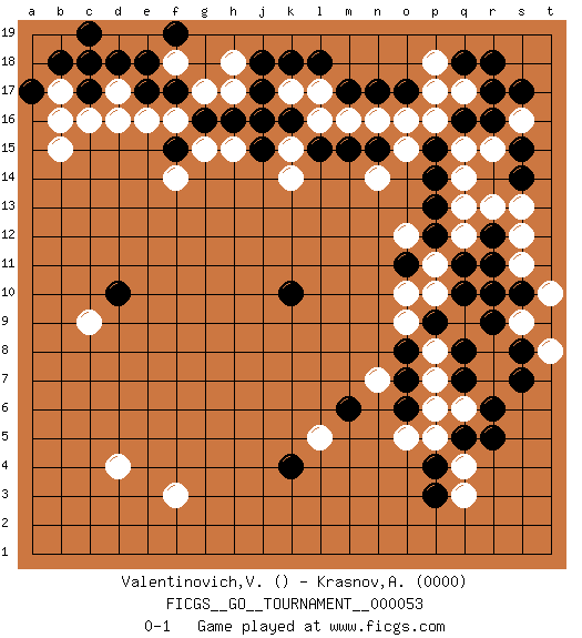 Last move : 0-1 2020 May 18 3:9:1 [Event "FICGS__GO__TOURNAMENT__000053"] [Site "FICGS"] [Date "2019.11.17"] [Round "1"] [Black "Valentinovich,Vladimir"] [White "Krasnov,Aleksandr"] [Result "0-1"] [Rating 2 "0000"] 1.q16 d4 2.k10 q4 3.d10 d16 4.q10 c9 5.k16 g17 6.k4 f3 7.p3 q3 8.r5 p5 9.e17 d17 10.d18 f16 11.h16 h17 12.j17 h15 13.f17 f18 14.e18 h18 15.g16 g15 16.j16 e16 17.c17 c18 18.b18 b17 19.c19 c16 20.c18 b15 21.a17 b16 22.f19 q17 23.r17 p17 24.o17 p16 25.p15 o16 26.n17 m16 27.m17 l17 28.l18 l16 29.l15 k15 30.j15 k14 31.j18 k17 32.m15 n16 33.n15 o15 34.r16 n14 35.f15 f14 36.k18 q15 37.p14 q14 38.p13 q13 39.p12 q12 40.q11 r15 41.q18 p18 42.r18 s16 43.s14 s13 44.s15 s11 45.r12 r13 46.r11 s12 47.s17 s9 48.s10 t10 49.r10 r8 50.q7 p7 51.q8 q6 52.r6 r7 53.r9 t8 54.s7 l5 55.m6 n7 56.o6 p11 57.o11 p10 58.s8 o12 59.q5 p6 60.o8 p8 61.p9 o10 62.p4 o9 63.o7 o5 0-1 This go game has been lost on time (started : 2019.11.17 14:21:43) Here are the names of the openings (joseki) played in the four corners : Corner q4 : q4 p3 Hoshi (Hwajeom, Seongjeom, Xingwei`) 4-4 Point. The star or hoshi (4-4) point, emphasizing influence at the potential expense of territory. Corner q16 : q16 q17 Hoshi (Hwajeom, Seongjeom, Xingwei`) 4-4 Point. The star or hoshi (4-4) point, emphasizing influence at the potential expense of territory. Player White won this Go (weiqi, baduk) game. Follow this game move after move (download)A meijin needs no joseki. (Anonymous) It's unlucky to be superstitious. (Dave Enteles)
