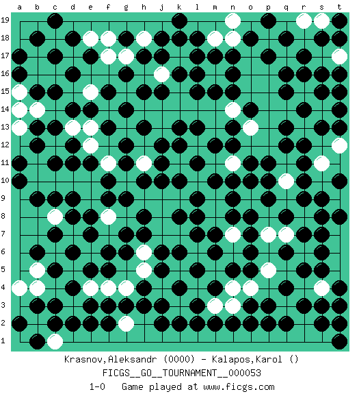 Last move : 1-0 2020 July 13 20:47:6 [Event "FICGS__GO__TOURNAMENT__000053"] [Site "FICGS"] [Date "2019.11.17"] [Round "1"] [Black "Krasnov,Aleksandr"] [White "Kalapos,Karol"] [Result "1-0"] [Rating 1 "0000"] 1.q16 p15 2.p17 r15 3.q15 q17 4.r17 p16 5.r16 o14 6.r14 p14 7.d16 q14 8.s15 n14 9.q18 m14 10.k16 k14 11.q12 q11 12.p11 l14 13.n16 m16 14.m17 j14 15.h15 h14 16.g14 j16 17.j15 j13 18.g12 g13 19.f13 e13 20.f15 f14 21.e14 e12 22.h13 g15 23.g16 h16 24.j17 h11 25.j12 k11 26.j11 f11 27.g11 g10 28.h10 h9 29.j10 j8 30.g9 k7 31.f10 g8 32.d4 l6 33.q4 m5 34.m7 k9 35.k10 n4 36.o3 o13 37.l11 o12 38.k12 m13 39.m12 e4 40.f5 k15 41.h17 k17 42.l16 o16 43.m15 j9 44.o10 n11 45.h7 l9 46.n12 j16 47.m10 m9 48.n9 r13 49.q13 m8 50.l7 d13 51.e11 j7 52.h8 h6 53.g7 q10 54.j5 f4 55.j6 j4 56.k4 q9 57.o8 l10 58.k6 f8 59.e8 p7 60.q8 n3 61.l5 h5 62.m6 n6 63.n5 l12 64.l13 f7 65.g6 o15 66.h4 n7 67.m4 e15 68.c13 c12 69.c11 o17 70.o18 g17 71.r11 e9 72.f9 c10 73.b12 b11 74.d12 b14 75.d14 m3 76.n8 o9 77.p9 q7 78.o6 s1 79.n2 r1 80.q2 q1 81.s3 p1 82.r7 o1 83.l2 n1 84.m2 m1 85.q6 l1 86.f3 g4 87.j3 h2 88.g3 k1 89.j2 j1 90.r9 h1 91.h3 g1 92.e7 f1 93.e2 e1 94.e3 r2 95.r3 q3 96.p3 k3 97.l3 d1 98.d9 c1 99.b3 b4 100.c3 d3 101.d2 d5 102.c5 n18 103.n17 f17 104.e17 b17 105.b15 m18 106.l18 k18 107.l17 s11 108.r12 s10 109.r10 d17 110.c17 p13 111.s13 s14 112.t14 t12 113.s9 r8 114.s8 p5 115.e5 c6 116.d6 d7 117.c7 c8 118.d8 b10 119.c9 d10 120.b9 e10 121.d11 e18 122.d18 c18 123.b18 b16 124.c19 c16 125.c15 s6 126.r5 r6 127.s7 s12 128.p10 p12 129.t10 t11 130.t13 t12 131.a11 s11 132.a16 a15 133.a17 a14 134.b6 f18 135.g18 h18 136.j18 s16 137.k19 k17 138.k18 a13 139.b13 p18 140.p19 n19 141.s2 g2 142.f2 s4 143.c2 b2 144.o2 o4 145.o5 q10 146.p2 s17 147.k2 b5 148.t2 t5 149.t1 t3 150.t4 t6 151.t3 t7 152.s5 r19 153.o11 m11 154.n10 n11 155.a2 a4 156.b1 g2 157.n15 c1 158.k13 t9 159.t8 t15 160.t16 t17 161.t15 t18 162.s18 t5 163.t19 s19 164.t18 t17 165.l15 t7 166.o7 n7 167.n13 o13 168.l8 t6 169.s6 s17 170.s16 t17 171.k8 m8 172.f6 f8 173.a10 m9 174.l9 n14 175.o14 1-0 Here are the names of the openings (joseki) played in the four corners : Corner q16 : q16 p15 Hoshi (Hwajeom, Seongjeom, Xingwei`) 4-4 Point. The star or hoshi (4-4) point, emphasizing influence at the potential expense of territory. Corner d16 : d16 j14 Hoshi (Hwajeom, Seongjeom, Xingwei`) 4-4 Point. The star or hoshi (4-4) point, emphasizing influence at the potential expense of territory. Corner q4 : l6 q4 This joseki is unknown. A weak or weird move has probably been played in this corner. Player Black won this Go (weiqi, baduk) game. Follow this game move after move (download)If you lose by one point, take a rest. (Anonymous) Nowadays, anyone who cannot speak English and is incapable of using the Internet is regarded as backward. (Al-Waleed bin Talal)