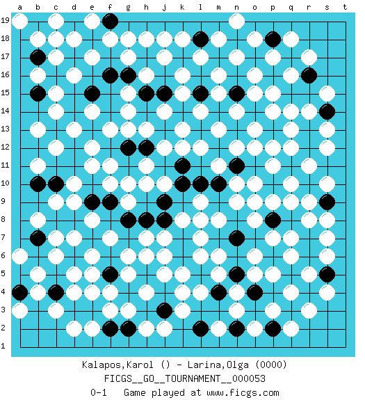 Last move : 0-1 2020 July 13 7:11:32 [Event "FICGS__GO__TOURNAMENT__000053"] [Site "FICGS"] [Date "2019.11.17"] [Round "1"] [Black "Kalapos,Karol"] [White "Larina,Olga"] [Result "0-1"] [Rating 2 "0000"] 1.k10 d4 2.e5 d16 3.f6 q4 4.g7 q16 5.h8 k16 6.f16 q10 7.q8 k4 8.j9 q6 9.l11 d10 10.d8 c6 11.m12 g17 12.k5 g3 13.n13 r14 14.o14 n17 15.o17 o16 16.k6 n3 17.n5 o5 18.k7 p17 19.k8 l9 20.k9 l8 21.k11 k13 22.j8 d13 23.j13 j14 24.j10 l7 25.j11 j12 26.g8 h6 27.f8 j5 28.e8 g10 29.g9 h10 30.f7 d7 31.e9 f10 32.e10 e11 33.c8 b8 34.e7 d5 35.n6 l6 36.l5 m5 37.n7 l4 38.h11 c3 39.n8 n9 40.p14 q12 41.p13 o12 42.o7 o9 43.f5 f4 44.g4 e4 45.m4 n4 46.h9 l12 47.m11 m13 48.m9 n12 49.n11 n14 50.o11 p11 51.g11 f11 52.p10 l14 53.h17 h18 54.k14 r8 55.r10 o10 56.l10 c17 57.c13 c12 58.f9 g14 59.d6 c7 60.g12 p12 61.p9 q9 62.m10 r17 63.h12 h13 64.p8 q7 65.q5 p5 66.b19 p7 67.c19 o8 68.d19 o6 69.e19 m6 70.m7 m8 71.f19 c9 72.f12 e12 73.g19 f13 74.h15 h16 75.h19 d9 76.j19 g5 77.k19 g13 78.l19 k12 79.m19 n10 80.p10 j7 81.e13 e14 82.e15 j6 83.j3 g6 84.b10 h7 85.h5 e6 86.f6 h4 87.h8 q14 88.k10 o13 89.l10 p15 90.k7 o15 91.n11 q13 92.q8 c14 93.e7 f7 94.f9 r3 95.n7 k3 96.g8 e8 97.e9 g9 98.p13 b18 99.g12 j17 100.l15 k15 101.h12 h11 102.m17 o18 103.o14 p14 104.m12 m11 105.k11 c18 106.s14 s13 107.m14 m15 108.m10 n19 109.n15 m16 110.r16 m18 111.l18 l17 112.k17 d18 113.e18 e17 114.c5 f18 115.j15 j18 116.l5 g18 117.g16 k18 118.j8 a19 119.e18 e19 120.d19 c19 121.c16 c15 122.p18 r11 123.r12 k8 124.k6 k5 125.n5 s15 126.j9 b11 127.b17 b16 128.l18 j10 129.b15 q18 130.b7 b5 131.a4 s10 132.s9 s8 133.o4 p3 134.p2 q2 135.c10 g15 136.f19 j2 137.f5 e5 138.c4 b4 139.c4 a3 140.d3 d2 141.e3 e2 142.f2 f3 143.f5 r5 144.r6 r9 145.r7 s6 146.p8 p9 147.p8 s7 148.s5 o2 149.n2 m2 150.l2 s4 151.a5 a6 152.a4 b13 153.r13 s12 154.g2 h2 0-1 Here are the names of the openings (joseki) played in the four corners : Corner d4 : d4 e5 Hoshi (Hwajeom, Seongjeom, Xingwei`) 4-4 Point. The star or hoshi (4-4) point, emphasizing influence at the potential expense of territory. Corner d16 : d16 f16 Hoshi (Hwajeom, Seongjeom, Xingwei`) 4-4 Point. The star or hoshi (4-4) point, emphasizing influence at the potential expense of territory. Ikken Takagakari (Hankan Nop'dakeolch'im, Yi Gaojia, 1-Space High Approach). White typically responds at 6-4 or 3-10. White 4-10 is played when White finds play on the right side advantageous. White 4-8 or 3-8 may be played when White has support at top. Corner q4 : q4 q8 Hoshi (Hwajeom, Seongjeom, Xingwei`) 4-4 Point. The star or hoshi (4-4) point, emphasizing influence at the potential expense of territory. Corner q16 : q16 l11 Hoshi (Hwajeom, Seongjeom, Xingwei`) 4-4 Point. The star or hoshi (4-4) point, emphasizing influence at the potential expense of territory. Player White won this Go (weiqi, baduk) game. Follow this game move after move (download)White is always trying to kill a bigger group than black is trying to save. (Anonymous) Have no fear of perfection - you'll never reach it. (Salvador Dali)