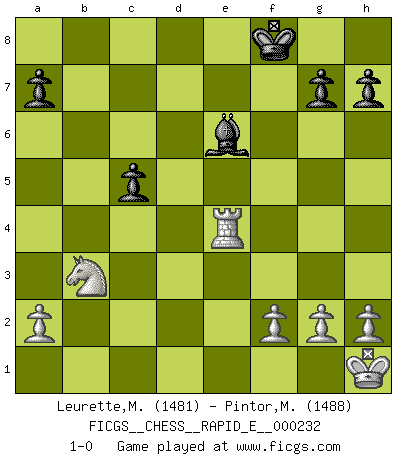 Last move : 1-0 2019 November 30 1:19:46 [Event "FICGS__CHESS__RAPID_E__000232"] [Site "FICGS"] [Date "2019.11.18"] [Round "1"] [White "Leurette,Marc-Antoine"] [Black "Pintor,Manuel"] [Result "1-0"] [WhiteElo "1481"] [BlackElo "1488"] 1.e4 e5 2.Nf3 Nc6 3.Bc4 Bc5 4.c3 Qf6 5.d4 exd4 6.e5 Qg6 7.Ng5 Nh6 8.Bd3 f5 9.exf6 Qxf6 10.Qh5+ Nf7 11.Nxf7 Qxf7 12.Qxc5 d6 13.Qg5 O-O 14.O-O Ne5 15.Qh4 Nxd3 16.cxd4 Qc4 17.Be3 Nxb2 18.Nd2 Qe2 19.Nb3 b6 20.Rac1 c5 21.dxc5 dxc5 22.Qg3 Rf6 23.Rfe1 Qg4 24.Qe5 Nd3 25.Qd5+ Be6 26.Qxa8+ Rf8 27.Qc6 Ne5 28.Qd6 Nf3+ 29.Kh1 Nxe1 30.Rxe1 Qe4 31.Qxf8+ Kxf8 32.Bxc5+ bxc5 33.Rxe4 1-0 Giuoco Piano Kingside Castling by player Black (move 13) Kingside Castling by player White (move 14) Player White won this chess game. Follow this game move after move (download)If a ruler does not understand Chess, how can he rule over a kingdom ? (King Khusros II) Wie kann ich Remis annehmen? Ich weiß ja gar nicht, wie ich stehe! (Fritz Sämisch) Cuando veas una buena jugada, trata de encontrar otra mejor. (Emanuel Lasker) Dans le domaine de la peinture, de la gravure et de la sculpture, dès la première décennie de notre siècle, les artistes abandonnent la représentation de la partie d'échecs pour se concentrer sur les pièces, sur les échiquiers et sur toutes les variations auxquelles les unes et les autres peuvent donner lieu. On passe en quelque sorte d'un thème social à un thème musical (au sens de la musica médiévale, c'est-à-dire d'une notion qui inclue le rythme, l'harmonie, la construction et la déconstruction, etc.). Graphiquement et picturalement, l'échiquier apparaît comme une structure ouverte, dynamique, d'une richesse infinie, autorisant toutes les combinatoires et débouchant sur des mouvements et des rythmes de nature exponentielle. (Michel Pastoureau) There are 10 types of people in this world: those who understand binary and those who don't. (Anonymous)
