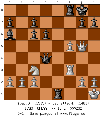 Last move : 0-1 2019 December 12 15:4:37 [Event "FICGS__CHESS__RAPID_E__000232"] [Site "FICGS"] [Date "2019.11.18"] [Round "1"] [White "Pipac,Darko"] [Black "Leurette,Marc-Antoine"] [Result "0-1"] [WhiteElo "1313"] [BlackElo "1481"] 1.e4 e5 2.Nf3 Nc6 3.d4 exd4 4.Nxd4 Bc5 5.Nxc6 bxc6 6.Nc3 Nf6 7.Bg5 O-O 8.Bc4 d6 9.O-O Qe7 10.Re1 Qe5 11.Bxf6 Qxf6 12.Qh5 Bxf2+ 13.Kh1 Bxe1 14.Rxe1 Qd4 15.Rf1 Qxc4 16.Kg1 Ba6 17.Rf3 f5 18.exf5 Rae8 19.Qg5 Qd4+ 20.Kh1 Re1+ 0-1 Scotch game Kingside Castling by player Black (move 7) Kingside Castling by player White (move 9) Player Black won this chess game. Follow this game move after move (download)A good player is always lucky. (Jose Raul Capablanca) Kein Großmeister ist normal. Sie unterscheiden sich nur im Ausmaß Ihrer Verrücktheit. (Viktor Kortschnoi) La táctica fluye a partir de una posición superior. (Bobby Fischer) Pour moi, les échecs ne sont pas un jeu mais un art. (Alexandre Alekhine) The modern world has divided itself into Conservatives and Progressives. The business of Progressives is to go on making mistakes. The business of the Conservatives is to prevent the mistakes from being corrected. (G.K. Chesterton)
