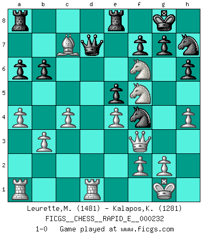Last move : 1-0 2019 November 25 18:44:42 [Event "FICGS__CHESS__RAPID_E__000232"] [Site "FICGS"] [Date "2019.11.18"] [Round "1"] [White "Leurette,Marc-Antoine"] [Black "Kalapos,Karol"] [Result "1-0"] [WhiteElo "1481"] [BlackElo "1281"] 1.e4 c5 2.Nf3 d6 3.Bb5+ Bd7 4.Bxd7+ Nxd7 5.c4 Ngf6 6.Nc3 e6 7.O-O Be7 8.d3 a6 9.a4 h6 10.b3 O-O 11.d4 cxd4 12.Nxd4 e5 13.Nf5 Nh7 14.Qg4 Bg5 15.Rd1 Ndf6 16.Qg3 Nh5 17.Qd3 Qb6 18.Nd5 Qd8 19.Ba3 b6 20.Bxd6 Re8 21.Bc7 Qd7 22.h4 Bf6 23.Qf3 Nf4 24.Nxf6+ 1-0 Sicilian : Canal-Sokolsky attack, 3...Bd7 Kingside Castling by player White (move 7) Kingside Castling by player Black (move 10) Player White won this chess game. Follow this game move after move (download)In Chess, at least, the brave inherit the earth. (Edmar Mednis) Strategie ist, wie man ein Mädchen auf den Rücksitz bekommt. Taktik ist, was man tut, wenn man dann dort ist. (Anonymous) Una buena memoria, concentración, imaginación y una fuerte voluntad, se requiere para llegar a ser un buen jugador. (Bobby Fischer) Les Echecs ne sont pas pour les âmes timides. Ils requièrent un homme entier, qui ne s'arrête pas aveuglément à ce qui a été déjà établi, mais qui tente individuellement de sonder les profondeurs du jeu. (W. Steinitz) At work, the authority of a person is inversely proportional to the number of pens that person is carrying. (Dan Rotaru)