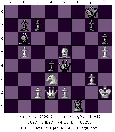 Last move : 0-1 2019 November 26 14:44:0 [Event "FICGS__CHESS__RAPID_E__000232"] [Site "FICGS"] [Date "2019.11.18"] [Round "1"] [White "George,Sebastine"] [Black "Leurette,Marc-Antoine"] [Result "0-1"] [WhiteElo "1000"] [BlackElo "1481"] 1.Nc3 e5 2.d3 d5 3.f4 d4 4.Ne4 Nf6 5.fxe5 Nxe4 6.dxe4 Nc6 7.Nf3 Bb4+ 8.Bd2 Bc5 9.g3 O-O 10.Bg2 Be6 11.a3 a5 12.O-O Qd7 13.Kh1 h6 14.Bf4 Bb6 15.h4 Rad8 16.Ne1 Bh3 17.Nd3 Bxg2+ 18.Kxg2 Qe6 19.b4 axb4 20.axb4 f6 21.exf6 Qxf6 22.Qd2 Qe7 23.b5 Qxe4+ 24.Kh2 Ne7 25.h5 Nd5 26.Be5 Ne3 27.Rxf8+ Rxf8 28.Rg1 Nf1+ 29.Rxf1 Rxf1 0-1 Dunst (Sleipner-Heinrichsen) Opening Kingside Castling by player Black (move 9) Kingside Castling by player White (move 12) Player Black won this chess game. Follow this game move after move (download)Fischer was a master of clarity and a king of artful positioning. His opponents would see where he was going but were powerless to stop him. (Bruce Pandolfini) Wenn ein Kopf und ein Buch zusammenstoßen und es klingt hohl, ist es denn allemal im Buche? (Georg Christoph Lichtenberg) Prefiero perder una partida realmente buena, que ganar una mala. (David Levy) Votre prénom est 'Tactique', votre deuxième prénom est 'Tactique' et votre nom est 'Tactique'. (Ken Smith) To send light into the darkness of men's hearts - such is the duty of the artist. (Schumann)