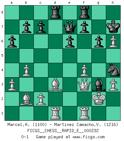 Last move : 0-1 2020 January 9 20:4:35 [Event "FICGS__CHESS__RAPID_E__000232"] [Site "FICGS"] [Date "2019.11.18"] [Round "1"] [White "Marcel,Alexis"] [Black "Martinez Camacho,Victor Hugo"] [Result "0-1"] [WhiteElo "1100"] [BlackElo "1216"] 1.f4 d5 2.Nf3 Nc6 3.e3 Nf6 4.b3 Bg4 5.Be2 e6 6.Bb2 Be7 7.O-O O-O 8.Nc3 a6 9.a3 Qd7 10.h3 Bh5 11.g4 Bg6 12.Nh4 Ne4 13.Nxe4 Bxe4 14.d3 Bxd3 15.Bxd3 Bxh4 16.b4 Rad8 17.Qf3 d4 18.Rad1 Qe7 19.exd4 g6 20.g5 h6 21.gxh6 Kh7 22.Kh2 Nxd4 23.Qe3 Nf5 24.Qf3 Bg3+ 25.Kg2 Nh4+ 0-1 Bird's Opening Kingside Castling by player White (move 7) Kingside Castling by player Black (move 7) Player Black won this chess game. Follow this game move after move (download)Chess is a fairy tale of 1001 blunders. (Savielly Tartakower) Alles was am Schachbrett zählt sind gute Züge. (Robert James Fischer) Debemos de asegurarnos de que el Ajedrez no se convierta en un lenguaje muerto, muy interesante, pero tan solo para un grupo muy pequeño. (Sytze Faber) Mais n'est-ce pas déjà le limiter injurieusement que d'appeler les échecs un jeu? N'est-ce pas aussi une science, un art, ou quelque chose qui, comme le cercueil de Mahomet entre ciel et terre, est suspendu entre l'un et l'autre, et qui réunit un nombre incroyable de contraires ? (Stefan Zweig) I have opinions of my own - strong opinions - but I don't always agree with them. (George Bush)