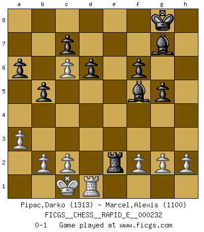 Last move : 0-1 2019 December 21 12:4:33 [Event "FICGS__CHESS__RAPID_E__000232"] [Site "FICGS"] [Date "2019.11.18"] [Round "1"] [White "Pipac,Darko"] [Black "Marcel,Alexis"] [Result "0-1"] [WhiteElo "1313"] [BlackElo "1100"] 1.e4 g6 2.d4 Bg7 3.Nc3 e6 4.Nf3 Ne7 5.Bg5 O-O 6.Ne5 f6 7.Nxg6 hxg6 8.Bh4 Nbc6 9.a3 a6 10.d5 exd5 11.exd5 Ne5 12.Qd4 Nf5 13.Qe4 Re8 14.O-O-O Nxh4 15.Qxh4 d6 16.Bc4 g5 17.Qd4 Nxc4 18.Qxc4 Bf5 19.Rhe1 Qd7 20.Rxe8+ Rxe8 21.Ne2 b5 22.Qc6 Qxc6 23.dxc6 Rxe2 0-1 Robatsch defense Kingside Castling by player Black (move 5) Queenside Castling by player White (move 14) Player Black won this chess game. Follow this game move after move (download)I like to say that Bobby Fischer was the greatest player ever. But what made Fischer a genius was his ability to blend an American freshness and pragmatism with Russian ideas about strategy. (Bruce Pandolfini) Vom Schach wurde gesagt das Leben sei dafür nicht lange genug. Aber das ist der Fehler des Lebens, nicht des Schach'. (Irving Chernev) Antes de los Finales, los dioses han colocado el Juego Medio. (Siegbert Tarrasch) Il s'avisa de me proposer d'apprendre les échecs qu'il jouait un peu... me voilà forcené des échecs. J'achète un échiquier, je m'enferme dans ma chambre, j'y passe des jours et des nuits à vouloir apprendre par cur toutes les parties. (Jean-Jacques Rousseau, Confessions) I would love to change the world, but they won't give me the source code. (Unknown)