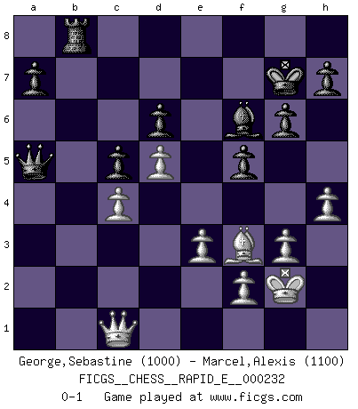 Last move : 0-1 2019 December 2 20:41:22 [Event "FICGS__CHESS__RAPID_E__000232"] [Site "FICGS"] [Date "2019.11.18"] [Round "1"] [White "George,Sebastine"] [Black "Marcel,Alexis"] [Result "0-1"] [WhiteElo "1000"] [BlackElo "1100"] 1.Nf3 f5 2.e3 Nf6 3.c4 g6 4.d4 Bg7 5.Nc3 O-O 6.Be2 d6 7.O-O Re8 8.b3 Nbd7 9.Bb2 e5 10.dxe5 Nxe5 11.Nd5 Nxd5 12.cxd5 Nxf3+ 13.Bxf3 Bxb2 14.Rb1 Be5 15.Qc2 Bd7 16.Rfc1 Rc8 17.a4 Qh4 18.g3 Qb4 19.Qe2 c6 20.Kh1 Kg7 21.Qd1 c5 22.Rc4 Qb6 23.Qd3 Qa6 24.Qc2 b6 25.Qc1 b5 26.axb5 Bxb5 27.Rh4 Bf6 28.Rf4 Bg5 29.Rc4 Bxc4 30.bxc4 Qa2 31.Rb2 Qa5 32.Kg2 Rb8 33.h4 Bf6 34.Rxb8 Rxb8 0-1 Reti v Dutch Kingside Castling by player Black (move 5) Kingside Castling by player White (move 7) Player Black won this chess game. Follow this game move after move (download)I prefer to lose a really good game than to win a bad one. (David Levy) Schach ist ein schwarz-weisser Dschungel. (Garry Kasparov) Del Ajedrez se ha dicho que la vida no es lo suficientemente larga para él, pero eso es culpa de la vida, no del Ajedrez. (William Ewart Napier) RxDa4 pat (...) A woman without a man is like a fish without a bicycle. (Gloria Steinem)