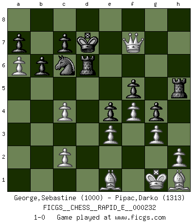 Last move : 1-0 2019 December 31 17:29:40 [Event "FICGS__CHESS__RAPID_E__000232"] [Site "FICGS"] [Date "2019.11.18"] [Round "1"] [White "George,Sebastine"] [Black "Pipac,Darko"] [Result "1-0"] [WhiteElo "1000"] [BlackElo "1313"] 1.Nc3 e5 2.d3 d5 3.f4 f6 4.g3 Bb4 5.a3 Bxc3+ 6.bxc3 Nc6 7.Bg2 Nge7 8.Nf3 Bf5 9.O-O e4 10.Nh4 Qd7 11.Nxf5 Qxf5 12.Bd2 O-O-O 13.Be3 Rhe8 14.Bf2 g5 15.e3 h5 16.Qxh5 Rh8 17.Qe2 g4 18.Bh1 Qh5 19.Be1 f5 20.Rf2 Rh6 21.Rd1 Rdh8 22.Rd2 Qh3 23.Rg2 Ng8 24.dxe4 dxe4 25.Bf2 Nf6 26.Qb5 Qh5 27.a4 Nd7 28.a5 Qf7 29.a6 b6 30.Rd5 Rh5 31.c4 R8h6 32.Be1 Nc5 33.Rgd2 Nd7 34.Rxd7 Qxd7 35.Rxd7 Kxd7 36.Qd5+ Rd6 37.Qf7+ 1-0 Dunst (Sleipner-Heinrichsen) Opening Kingside Castling by player White (move 9) Queenside Castling by player Black (move 12) Player White won this chess game. Follow this game move after move (download)The game of Chess is not merely an idle amusement; several very valuable qualities of the mind are to be acquired and strengthened by it, so as to become habits ready on all occasions; for life is a kind of Chess. (Benjamin Franklin) Dass jemand wie Surab Asmaiparaschwili, der selbst Elopunkte gekauft hat , Vize-Präsident der Fide werden konnte, sagt schon einges über den Zustand dieser Organisation aus. (Joel Lautier) Vive, pierde y aprende al observar a tu oponente como gana. (Amber Steenbock) Un footballeur joue avec ses pieds, parfois avec sa tête. Un joueur d'échecs ne joue qu'avec sa tête. Et quand il ne joue plus, il meurt. (Jacob Murray) Do you know these so called Volunteers don't even get paid! (Simpsons)