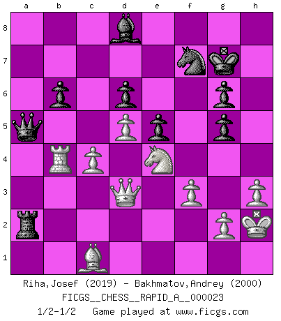 Last move : 1/2-1/2 2007 July 29 10:36:0 [Event "FICGS__CHESS__RAPID_A__000023"] [Site "FICGS"] [Date "2007.06.30"] [Round "1"] [White "Riha,Josef"] [Black "Bakhmatov,Andrey"] [Result "1/2-1/2"] [WhiteElo "2019"] [BlackElo "2000"] 1.d4 Nf6 2.c4 c5 3.d5 e5 4.Nc3 d6 5.e4 Be7 6.Be2 O-O 7.Nf3 Ne8 8.O-O f5 9.exf5 Bxf5 10.Nd2 g5 11.Nde4 Na6 12.Ng3 Bg6 13.Bd3 Ng7 14.Bxg6 hxg6 15.Nge4 Nf5 16.Qg4 Nh6 17.Qh3 Kg7 18.Qd3 Nc7 19.a3 a5 20.b3 b6 21.Qd2 Nf7 22.f3 Rb8 23.Qd3 Qd7 24.Ne2 Rh8 25.Bd2 Ne8 26.Rab1 Nf6 27.Nxf6 Bxf6 28.Nc3 Ra8 29.Ne4 Rhb8 30.b4 axb4 31.axb4 Rb7 32.Rb2 Rba7 33.Bc3 cxb4 34.Rxb4 Qc7 35.Rfb1 Bd8 36.Qe3 Ra3 37.Qc1 Ra2 38.Bd2 R8a4 39.Be3 Rxb4 40.Rxb4 Qa7 41.h3 Qa5 42.Rb1 Qa6 43.Nc3 Ra5 44.Qf1 Ra3 45.Bd2 Qc8 46.Kh2 Ra7 47.Qe2 Ra3 48.Rb4 Qa6 49.Ne4 Ra2 50.Qd3 Ra3 51.Qc2 Ra2 52.Qc3 Qa5 53.Qd3 Qa6 54.Bc1 Qa5 1/2-1/2 Czech Benoni defense Kingside Castling by player Black (move 6) Kingside Castling by player White (move 8) This chess game ended in a draw. Follow this game move after move (download)Nonsense was the last thing Fischer was interested in, as far as Chess was concerned. (Elie Agur) Oft bringt ein stiller Zug das Erdbeben. (Richard Reti) Uno no tiene que jugar muy bien, es suficiente jugar mejor que el oponente. (Siegbert Tarrasch) Il a essayé de se convaincre qu'il pourrait empêcher toutes les erreurs et ne jamais perdre. L'horreur ! Gary Kasparov au sujet de Robert Fischer. If we don't succeed, we run the risk of failure. (George W. Bush)
