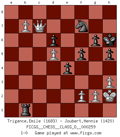 Last move : 1-0 2019 December 7 12:18:37 [Event "FICGS__CHESS__CLASS_D__000259"] [Site "FICGS"] [Date "2019.11.19"] [Round "1"] [White "Trigance,Emile"] [Black "Joubert,Hennie"] [Result "1-0"] [WhiteElo "1683"] [BlackElo "1420"] 1.e4 c5 2.d4 cxd4 3.c3 dxc3 4.Nxc3 Nc6 5.Nf3 e6 6.Bc4 a6 7.O-O d6 8.Qe2 Nf6 9.Rd1 Qc7 10.Bf4 e5 11.Nd5 Nxd5 12.exd5 Na5 13.Bd3 Be7 14.Rac1 Qd8 15.Be3 b5 16.b4 Nb7 17.Rc3 O-O 18.Rdc1 Bg4 19.h3 Bh5 20.Bf5 Bg6 21.Rc8 Rxc8 22.Rxc8 Bxf5 23.Rxd8 Rxd8 24.a4 Bd7 25.axb5 Bxb5 26.Qc2 g6 27.Bh6 Bf6 28.Qc7 Rd7 29.Qc8+ Bd8 30.Bg5 Kg7 31.Bxd8 Nxd8 32.Nd2 f6 33.Ne4 Nf7 34.Nc3 Re7 35.Nxb5 axb5 36.Qc6 Ra7 37.Qxb5 Ra1+ 38.Kh2 Rd1 39.Qc4 Rb1 40.b5 h5 41.Qc6 f5 42.b6 e4 43.b7 Kh6 44.Qc7 1-0 Sicilian : Smith-Morra gambit Kingside Castling by player White (move 7) Kingside Castling by player Black (move 17) Player White won this chess game. Follow this game move after move (download)A good sacrifice is one that is not necessarily sound but leaves your opponent dazed and confused. (Rudolph Spielmann) Sitze auf Deine Hände. (Siegbert Tarrasch) Cuando tengo las piezas blancas, yo gano porque soy blanco; Cuando tengo las piezas negras, yo gano porque soy Bogolyubov. (Bogolyubov) Toutes les manuvres exécutées sur une colonne ouverte ont pour but ultime l'intrusion définitive sur la septième ou la huitième rangée, en plein cur de la position ennemie. (Aaron Nimzovitch) Those who make the worst use of their time are the first to complain of its brevity. (Jean de la Bruyere)