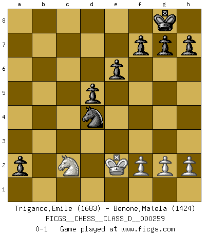 Last move : 0-1 2020 April 6 15:26:31 [Event "FICGS__CHESS__CLASS_D__000259"] [Site "FICGS"] [Date "2019.11.19"] [Round "1"] [White "Trigance,Emile"] [Black "Benone,Mateia"] [Result "0-1"] [WhiteElo "1683"] [BlackElo "1424"] 1.e4 c5 2.d4 cxd4 3.c3 Nf6 4.e5 Nd5 5.Nf3 Nc6 6.cxd4 d6 7.Bc4 Nb6 8.Bb5 dxe5 9.Nxe5 Bd7 10.Bxc6 Bxc6 11.Nxc6 bxc6 12.Qf3 Qd5 13.Qxd5 cxd5 14.O-O e6 15.Nc3 Bb4 16.Ne2 O-O 17.a3 Bd6 18.Bf4 Bxf4 19.Nxf4 Nc4 20.b4 a5 21.b5 a4 22.Ra2 Rfb8 23.Rb1 Ra5 24.Nd3 Raxb5 25.Rb4 Nxa3 26.Rab2 Rxb4 27.Rxb4 Rxb4 28.Nxb4 Nb5 29.Nc2 a3 30.Kf1 a2 31.Ke2 Nxd4+ 0-1 Sicilian : Smith-Morra gambit Kingside Castling by player White (move 14) Kingside Castling by player Black (move 16) Player Black won this chess game. Follow this game move after move (download)We don't really know how the game was invented, though there are suspicions. As soon as we discover the culprits, we'll let you know. (Bruce Pandolfini) Die jungen Leute sollen verstehen, dass sie noch etwas von mir lernen können und müssen. (Viktor Kortschnoi) ¿Esta Bobby Fischer algo cuerdo?. (Salo Flohr) Il vaut toujours mieux jouer un plan faux de façon logique que de n'avoir pas de plan du tout. (Victor Kortchnoï) When it is a question of money, everybody is of the same religion. (Voltaire)