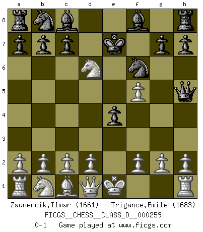 Last move : 0-1 2019 November 20 22:18:16 [Event "FICGS__CHESS__CLASS_D__000259"] [Site "FICGS"] [Date "2019.11.19"] [Round "1"] [White "Zaunercik,Ilmar"] [Black "Trigance,Emile"] [Result "0-1"] [WhiteElo "1661"] [BlackElo "1683"] 1.e4 e5 2.Nf3 f5 3.exf5 e4 4.Ne5 Nf6 5.Be2 d6 6.Bh5+ Ke7 7.Nf7 Qe8 8.Nxd6 Qxh5 0-1 Latvian counter-gambit Player Black won this chess game. Follow this game move after move (download)Nonsense was the last thing Fischer was interested in, as far as Chess was concerned. (Elie Agur) Wenn sie aufgeben, dann danke ich Ihnen für das Spiel (Eventualzug beim Fernschach). (Anonymous) La pasion por jugar al Ajedrez es una de las mas inexplicables en el mundo. (H.G. Wells) Je fais ceci parce que dans cinquante coups j'obtiendrai cela; je m'appelle Mikhail Moisevitch Botvinnik. (Botvinnik) A mistake is only a mistake if you let it happen twice. Otherwise it is a learning experience. (Daniel Parmet)