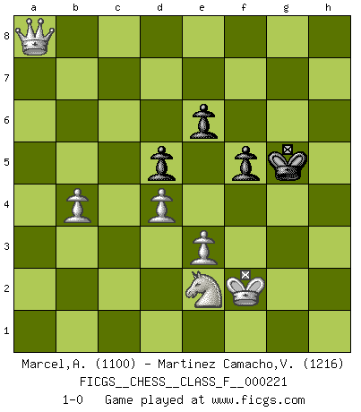 Last move : 1-0 2020 March 15 22:11:18 [Event "FICGS__CHESS__CLASS_F__000221"] [Site "FICGS"] [Date "2019.11.19"] [Round "1"] [White "Marcel,Alexis"] [Black "Martinez Camacho,Victor Hugo"] [Result "1-0"] [WhiteElo "1100"] [BlackElo "1216"] 1.f4 d5 2.Nf3 Nf6 3.e3 Bg4 4.Be2 e6 5.O-O Be7 6.b3 O-O 7.Bb2 Nbd7 8.h3 Bxf3 9.Bxf3 Rc8 10.Nc3 c5 11.Ne2 a6 12.a3 c4 13.Rc1 cxb3 14.cxb3 b5 15.b4 Nb6 16.d3 Na4 17.Ba1 Rxc1 18.Qxc1 h6 19.Qd2 Qd6 20.Be5 Qb6 21.Bd4 Qb8 22.Rc1 Rc8 23.Be5 Qb7 24.Ng3 Nd7 25.Bd4 Rxc1+ 26.Qxc1 Bh4 27.Ne2 Be7 28.Qa1 Bf6 29.Bxf6 Nxf6 30.Ng3 Qb6 31.Kf2 Qc6 32.d4 Qc2+ 33.Ne2 Ne4+ 34.Bxe4 Qxe4 35.g4 g5 36.fxg5 hxg5 37.Nc3 Qc2+ 38.Ne2 Nc3 39.Qxc3 Qe4 40.Qc8+ Kg7 41.Qxa6 Qh1 42.Qxb5 Qxh3 43.a4 Qxg4 44.a5 Qh4+ 45.Ng3 Qh2+ 46.Kf3 g4+ 47.Kxg4 f5+ 48.Kf3 Kf6 49.a6 Qd2 50.Qb7 Qd1+ 51.Kg2 Qd2+ 52.Kf3 Qd1+ 53.Kf2 Qd2+ 54.Ne2 Qa2 55.a7 Kg5 56.a8Q Qxa8 57.Qxa8 1-0 Bird's Opening Kingside Castling by player White (move 5) Kingside Castling by player Black (move 6) Promotion Queen by player White (move 56) 10 pieces endgame at move 57 : White KQNPPP , Black KPPP WHITE : King + 1 Queen 1 Knight 3 Pawns BLACK : King + 3 Pawns Player White won this chess game. Follow this game move after move (download)I have never in my life played the French Defence, which is the dullest of all openings. (Wilhelm Steinitz) Jeder leidlich begabte Spieler, er braucht keineswegs hervorragend veranlagt zu sein, kann es zum Meister bringen. Aber das ist ja auch gar nicht nötig! Der richtige Standpunkt ist es, zu seinem Vergnügen zu spielen, und man glaube ja nicht, dass der Genuss proportional dem Können sei. (Siegbert Tarrasch) Coloca el contenido de las piezas del Ajedrez en un sombrero, agitalo vigorosamente, arrojalas en un tablero desde una altura de 30 centimetros y así obtendras el estilo de Steinitz. (H. E. Bird) A chaque perte on perd un peu de soi. (Joël Lautier) Political correctness is subjecting us to gross incompetence. (Johann Piek)