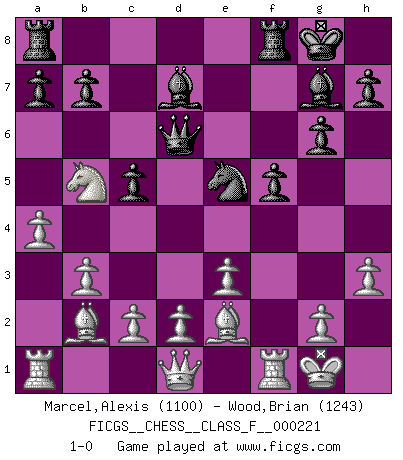 Last move : 1-0 2020 February 18 14:39:45 [Event "FICGS__CHESS__CLASS_F__000221"] [Site "FICGS"] [Date "2019.11.19"] [Round "1"] [White "Marcel,Alexis"] [Black "Wood,Brian"] [Result "1-0"] [WhiteElo "1100"] [BlackElo "1243"] 1.f4 d5 2.Nf3 c5 3.b3 Nf6 4.Bb2 Nc6 5.e3 Qc7 6.Be2 g6 7.O-O Bg7 8.a3 O-O 9.Nc3 e5 10.fxe5 Ng4 11.h3 Ngxe5 12.Nxe5 Nxe5 13.a4 f5 14.Nxd5 Qd6 15.Nc3 Bd7 16.Nb5 1-0 This chess game has been lost on time (started : 2019.11.19 22:43:13) Bird's Opening Kingside Castling by player White (move 7) Kingside Castling by player Black (move 8) Player White won this chess game. Follow this game move after move (download)You sit at the board and suddenly your heart leaps. Your hand trembles to pick up the piece and move it. But what Chess teaches you is that you must sit there calmly and think about whether it's really a good idea and whether there are other better ideas. (Stanley Kubrick) Jede Eröffnung ist gut genug um gespielt zu werden, wenn nur ihr Ruf schlecht genug ist. (Savielly Grigorievitsch Tartakower) Hay dos clases de hombres: aquellos que se conforman en dejarse llevar por las circunstancias y que juegan barajas y aquellos decididos a controlar las circunstancias y que juegan al Ajedrez. (Mortimer Collins) Les Echecs ne sont pas pour les âmes timides. Ils requièrent un homme entier, qui ne s'arrête pas aveuglément à ce qui a été déjà établi, mais qui tente individuellement de sonder les profondeurs du jeu. (W. Steinitz) Every now and then a man's mind is stretched by a new idea and never shrinks back to its former dimensions. (Oliver Wendell Holmes, Sr.)