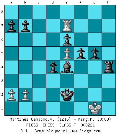 Last move : 0-1 2020 January 30 16:7:41 [Event "FICGS__CHESS__CLASS_F__000221"] [Site "FICGS"] [Date "2019.11.19"] [Round "1"] [White "Martinez Camacho,Victor Hugo"] [Black "King,Kevin"] [Result "0-1"] [WhiteElo "1216"] [BlackElo "0969"] 1.e4 e6 2.d4 d5 3.Nd2 Nf6 4.e5 Nfd7 5.f4 f5 6.Ngf3 Be7 7.Be2 c5 8.O-O O-O 9.c3 Nc6 10.Re1 Rf7 11.Ng5 Bxg5 12.fxg5 cxd4 13.cxd4 Qxg5 14.Nc4 Qh4 15.Nd6 Qxd4+ 16.Qxd4 Nxd4 17.Nxf7 Kxf7 18.Bf4 Nc2 19.Rac1 Nxe1 20.Rxe1 Nb8 21.Rc1 Nc6 22.Bb5 Bd7 23.Bxc6 Bxc6 24.Kf2 Rd8 25.Rd1 d4 26.g3 h6 27.h4 Kg6 28.Rd2 Be4 29.Rd1 Kh5 30.Rc1 g5 31.hxg5 hxg5 32.Bd2 Rh8 33.Rc7 Kg4 34.Kg1 Kxg3 35.Be1+ Kf3 36.Re7 Ke2 37.Bh4 Rxh4 0-1 French : Tarrasch, Closed variation Kingside Castling by player White (move 8) Kingside Castling by player Black (move 8) Player Black won this chess game. Follow this game move after move (download)I guess a certain amount of temperament is expected of Chess geniuses. (Ron Gross) Mit sehr nachdenklichem Gesicht schreitet Bobby durch den Turniersaal. Was ist passiert?, fragt Lombardy. Ich stehe schlecht, antwortet Fischer. Lombardy: Dann biete doch einfach Remis an. Fischer: So schlecht stehe ich nun auch wieder nicht! (Robert James Fischer) El Ajedrez es la vida. (Bobby Fischer) Avec des compensations pour le matériel en plus... (Anonyme) Never risk one's whole fortune unless supported by one's entire army. (Niccolo Machiavelli)