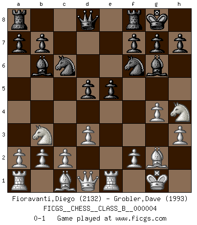 Last move : 0-1 2006 August 15 19:12:33 [Event "FICGS__CHESS__CLASS_B__000004"] [Site "FICGS"] [Date "2006.06.19"] [Round "1"] [White "Fioravanti,Diego"] [Black "Grobler,Dave"] [Result "0-1"] [WhiteElo "2132"] [BlackElo "1993"] 1.g3 d5 2.Bg2 e5 3.d3 c6 4.Nd2 Nf6 5.e4 Bd6 6.Ngf3 O-O 7.O-O Bg4 8.h3 Bh5 9.exd5 cxd5 10.Re1 Nc6 11.g4 Bg6 12.Nh4 Bc5 13.Nb3 Bb6 0-1 Benko's Opening Kingside Castling by player Black (move 6) Kingside Castling by player White (move 7) Player Black won this chess game. Follow this game move after move (download)Chess is a more highly symbolic game, but the aggressions are therefore even more frankly represented in the play. It probably began as a war game; that is, the representation of a miniature battle between the forces of two kingdoms. (Karl Meninger) Vielleicht wirkt die Aura früherer Spieler glanzvoller als die der heutigen Spieler, aber das liegt daran, dass man kein Programm wie Fritz hatte, das einem all die Löcher in ihren Partien zeigt. (Vladimir Kramnik) Aunque la mayoría de la gente disfruta observar las partidas de los grandes Maestros de ataque, algunos de los jugadores mas notables en la historia han sido los jugadores silenciosos posicionales. Lentamente ellos te aplastan despojandote de tu espacio, congestionando tus piezas y dejandote virtualmente sin nada que hacer. (Yasser Seirawan) Vouloir jouer aux échecs contre soi-même est aussi paradoxal que vouloir marcher sur son ombre. (Stefan Zweig) It's only after you lost everything, Tyler says, that you're free to do anything. (Chuck Palahniuk, Fight Club)