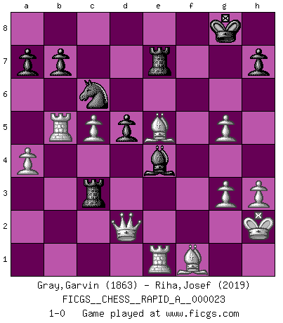 Last move : 1-0 2007 August 28 15:22:0 [Event "FICGS__CHESS__RAPID_A__000023"] [Site "FICGS"] [Date "2007.06.30"] [Round "1"] [White "Gray,Garvin"] [Black "Riha,Josef"] [Result "1-0"] [WhiteElo "1863"] [BlackElo "2019"] 1.d4 Nf6 2.c4 e6 3.Nc3 Bb4 4.e3 c5 5.Nge2 cxd4 6.exd4 d5 7.c5 Ne4 8.a3 Bxc3+ 9.Nxc3 Nxc3 10.bxc3 O-O 11.Rb1 Qa5 12.Qd3 e5 13.dxe5 Nc6 14.f4 g6 15.Rb5 Qd8 16.Be3 Bf5 17.Qd2 Qd7 18.Be2 f6 19.exf6 Rxf6 20.O-O Re8 21.Bf2 Rf7 22.Re1 Be4 23.Rb2 Ref8 24.Be3 Qf5 25.a4 Re7 26.h3 Qf6 27.Rb5 Qh4 28.Kh2 Qf6 29.Bf1 g5 30.fxg5 Qe5+ 31.g3 Rf3 32.Bf4 Rxc3 33.Bxe5 1-0 Nimzo-Indian : 4.e3 c5 Kingside Castling by player Black (move 10) Kingside Castling by player White (move 20) Player White won this chess game. Follow this game move after move (download)A thorough understanding of the typical mating continuations makes the most complicated sacrificial combinations leading up to them not only not difficult, but almost a matter of course. (Siegbert Tarrasch) Ein Großmeister muß tausende Partien in seinem Kopf speichern, denn diese sind für Ihn, was die Worte der Muttersprache für gewöhnliche Leute sind, oder Noten für Musiker... (Garry Kasparov) El Ajedrez es un expediente tonto que hace creer a la gente inactiva que hacen una cosa muy astuta cuando solamente estan perdiendo su tiempo. (George Bernard Shaw) Le génie consiste à savoir transgresser les règles au moment opportun. (Teichmann) Big Chess is a place for big hallucinations. (Thibault de Vassal)