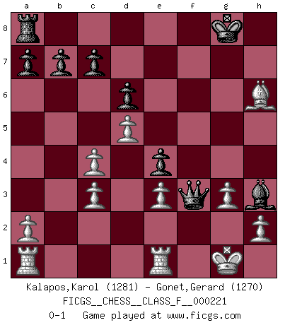 Last move : 0-1 2019 November 22 12:13:56 [Event "FICGS__CHESS__CLASS_F__000221"] [Site "FICGS"] [Date "2019.11.19"] [Round "1"] [White "Kalapos,Karol"] [Black "Gonet,Gerard"] [Result "0-1"] [WhiteElo "1281"] [BlackElo "1270"] 1.d4 Nf6 2.c4 g6 3.g3 Bg7 4.Nc3 O-O 5.Nf3 d6 6.Bg2 Nc6 7.O-O e5 8.Ng5 Bd7 9.Bxc6 Bxc6 10.d5 Bd7 11.Kg2 h6 12.Nge4 Nxe4 13.Nxe4 f5 14.Nc3 Qc8 15.Qc2 f4 16.Qxg6 Bh3+ 17.Kg1 Rf6 18.Qxf6 Bxf6 19.Re1 fxg3 20.fxg3 Qf5 21.Bxh6 e4 22.e3 Bxc3 23.bxc3 Qf3 0-1 King's Indian : 3.g3 Kingside Castling by player Black (move 4) Kingside Castling by player White (move 7) Player Black won this chess game. Follow this game move after move (download)Chess is a more highly symbolic game, but the aggressions are therefore even more frankly represented in the play. It probably began as a war game; that is, the representation of a miniature battle between the forces of two kingdoms. (Karl Meninger) Ja, jede Frau in Holland liebt mich bestimmt, und alle Männer hassen mich. (Loek van Wely) El juego del Ajedrez no es solamente una diversión quieta; algunas cualidades muy valuables de la mente se pueden adquirir y cultivar con el, como convertirlos en habitos disponibles para toda ocasión; ya que la vida es algo así como el Ajedrez. (Benjamin Franklin) Je fais ceci parce que dans cinquante coups j'obtiendrai cela; je m'appelle Mikhail Moisevitch Botvinnik. (Botvinnik) All war is based on deception. (Sun Tzu)