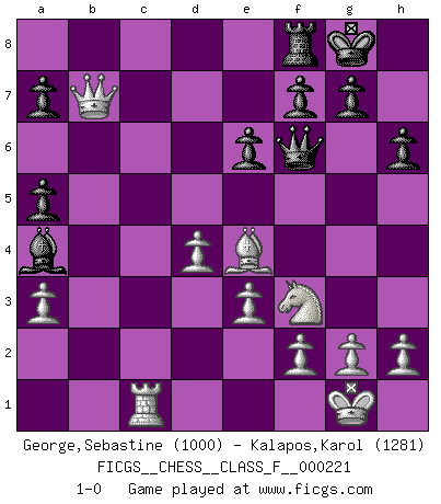 Last move : 1-0 2019 November 27 12:6:19 [Event "FICGS__CHESS__CLASS_F__000221"] [Site "FICGS"] [Date "2019.11.19"] [Round "1"] [White "George,Sebastine"] [Black "Kalapos,Karol"] [Result "1-0"] [WhiteElo "1000"] [BlackElo "1281"] 1.Nf3 Nf6 2.e3 d5 3.c4 e6 4.d4 c6 5.Nc3 Bb4 6.a3 Bxc3+ 7.bxc3 Ne4 8.Qc2 O-O 9.cxd5 cxd5 10.Be2 Nc6 11.O-O Qa5 12.c4 Nb4 13.Qb2 Nc6 14.cxd5 Qxd5 15.Qc2 Bd7 16.Bc4 Qf5 17.Bd3 Qf6 18.Bxe4 Rac8 19.Qb3 Na5 20.Qb4 b6 21.Bd2 Rc4 22.Qb2 Ba4 23.Bxa5 bxa5 24.Rfc1 Rxc1+ 25.Rxc1 h6 26.Qb7 1-0 Reti Opening Kingside Castling by player Black (move 8) Kingside Castling by player White (move 11) Player White won this chess game. Follow this game move after move (download)Spassky will not be psyched out by Fischer. (Mike Goodall) Darum geht es im Schach. Einen Tag gibst du deinem Gegner eine Lektion, am nächsten Tag gibt er dir eine. (Robert James Fischer) Con o sin el título, Bobby Fischer fue sin lugar a dudas el mas grande jugador de su época. (Burt Hochberg) Nous sommes les pions de la mystérieuse partie d'Echecs jouée par Dieu. Il nous déplace, nous arrête, nous pousse encore, puis nous lance un à un dans la boîte du Néant. Epitaphe sur la tombe de David Janowsky (1868-1927). A computer lets you make more mistakes faster than any invention in human history - with the possible exceptions of handguns and tequila. (Mitch Ratcliffe)