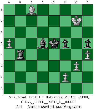Last move : 0-1 2007 July 8 19:37:6 [Event "FICGS__CHESS__RAPID_A__000023"] [Site "FICGS"] [Date "2007.06.30"] [Round "1"] [White "Riha,Josef"] [Black "Dolganiuc,Victor"] [Result "0-1"] [WhiteElo "2019"] [BlackElo "2000"] 1.d4 d5 2.c4 e6 3.Nc3 Nf6 4.Nf3 dxc4 5.e4 Bb4 6.Bg5 c5 7.Bxc4 cxd4 8.Nxd4 Qa5 9.Bd2 Qc5 10.Qb3 Nxe4 11.Be3 Bxc3+ 12.bxc3 Qa5 13.O-O Nc6 14.Nxc6 bxc6 15.Rfe1 O-O 16.Qb4 Qxb4 17.cxb4 Nc3 18.Bc5 Rd8 19.a4 Nd5 20.Rad1 Bb7 21.a5 a6 22.Kf1 Rd7 23.g3 Rad8 24.Rd3 h6 25.Bb3 g6 26.h4 Kg7 27.Bc2 h5 28.Ra3 Nc7 29.Bb6 Nb5 30.Rae3 Re8 31.Be4 Nc7 32.Bf3 Kg8 33.Bxc7 Rxc7 34.Rd1 Kf8 35.Rc3 Ke7 36.Ke2 Rb8 37.Rdc1 Rd8 38.Ke3 Rd6 39.Rc5 Rc8 40.Bg2 Kd8 41.Be4 Kd7 42.R1c3 Re8 43.Kf4 Rb8 44.R3c4 Rc8 45.Kg5 Ke7 46.Bc2 Rd2 47.Rf4 Rd5+ 48.Kh6 Rf8 49.Rf3 Rd4 50.Kg7 R4d8 51.Bd3 f5 52.Kxg6 Bc8 53.Rxc6 Rg8+ 54.Kh6 Bb7 55.Rc7+ Kf6 56.Re3 Rh8+ 57.Rh7 Rdg8 58.Rxe6+ Kxe6 59.Bc4+ Bd5 60.Rxh8 Rxh8+ 61.Kg7 Rb8 62.Bxa6 Rxb4 63.Bc8+ Ke5 0-1 QGD : 4.Nf3 Kingside Castling by player White (move 13) Kingside Castling by player Black (move 15) Player Black won this chess game. Follow this game move after move (download)Discovered check is the dive bomber of the Chessboard. (Reuben Fine) Ich erzeugte keinen Neid, da mich die Schachspieler als Musiker und die Musiker als Schachspieler betrachteten. (Mark Taimanov) A la fecha, Fischer esta simplemente un nivel arriba de todos los mejores jugadores de Ajedrez del mundo. (John Jacobs) Les Cavaliers se révèlent fort utiles dans les positions fermées. D'habitude, les Fous sont un peu plus forts que les Cavaliers dans les positions ouvertes. Qu'on le veuille ou non, il restera toujours des exceptions ! Luck is when opportunity knocks and you answer. (Anonymous)