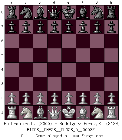 Last move : 0-1 2020 January 1 1:48:28 [Event "FICGS__CHESS__CLASS_A__000221"] [Site "FICGS"] [Date "2019.11.21"] [Round "1"] [White "Hoibraaten,Tormod"] [Black "Rodriguez Perez,Rene"] [Result "0-1"] [WhiteElo "2000"] [BlackElo "2139"] 0-1 This chess game has been lost on time (started : 2019.11.21 19:43:15) Player Black won this chess game. Follow this game move after move (download)All Chess players should have a hobby. (Savielly Tartakower) Im Schach nämlich geht es darum, daß Ich des Gegners klein zu kriegen, sein Ego zu zerbrechen und zu zermahlen, seine Selbstachtung zu zertreten und zu verscharren und seine ganze mißachtenswerte sogenannte Persönlichkeit ein für alle Mal tot zu hacken und zu zerstampfen und dadurch die menschliche Gesellschaft von einer stinkenden Pestbeule zu befreien. Es ist ein königliches Spiel. (Robert James Fischer) Siempre es mucho mejor sacrificar las piezas de tu oponente. (Savielly Tartakover) Le thème de l'attaque double intervient d'une manière ou d'une autre dans l'immense majorité des combinaisons. (Youri Averbakh) The mind is like a parachute, it only functions when its open. (Unknown)