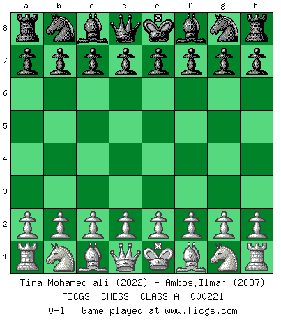 Last move : 0-1 2020 January 1 1:48:28 [Event "FICGS__CHESS__CLASS_A__000221"] [Site "FICGS"] [Date "2019.11.21"] [Round "1"] [White "Tira,Mohamed ali"] [Black "Ambos,Ilmar"] [Result "0-1"] [WhiteElo "2022"] [BlackElo "2037"] 0-1 This chess game has been lost on time (started : 2019.11.21 19:43:15) Player Black won this chess game. Follow this game move after move (download)Capture of the adverse King is the ultimate but not the first object of the game. (William Steinitz) Schach ist Krieg, im Schach geht es um testosterongesteuerte Urschreie. (Garry Kasparov) No puedes jugar al Ajedrez si eres de corazón noble. (Proverbio Francés) Les Echecs sont affaire de jugement sensible. Savoir quand frapper et quand esquiver. (Fischer) . 'gn is not allowed in chess unless n is an integer between 1 and 8 inclusive, where 1 and 8 are to interpreted as the standard numerals standing for integers in the ordered real-closed field R, with the *canonical* ordering. (As opposed to, say, an integer in the domain Z[2+i*sqrt(5)] or an integer in some exotic Grothendieck topos). (Normajean Yates)