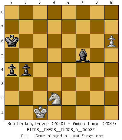 Last move : 0-1 2021 January 9 23:28:22 [Event "FICGS__CHESS__CLASS_A__000221"] [Site "FICGS"] [Date "2019.11.21"] [Round "1"] [White "Brotherton,Trevor"] [Black "Ambos,Ilmar"] [Result "0-1"] [WhiteElo "2040"] [BlackElo "2037"] 1.b4 e5 2.Bb2 Bxb4 3.Bxe5 Nf6 4.c4 O-O 5.Nf3 d5 6.e3 Re8 7.Bb2 c6 8.Be2 dxc4 9.Bxc4 b5 10.Be2 a6 11.a4 Bb7 12.O-O Nbd7 13.Nc3 Bf8 14.Qb3 b4 15.Nb1 a5 16.Rc1 Nc5 17.Qc2 Nce4 18.h3 Nd5 19.Bd3 Nd6 20.Bxh7+ Kh8 21.Bd3 c5 22.Qd1 Rc8 23.Bf1 c4 24.Ra2 Kg8 25.Bd4 Nf5 26.Rxc4 Rxc4 27.Bxc4 Nf4 28.d3 Nxg2 29.Ne5 Rxe5 30.Bxe5 Ngh4 31.Nd2 Nxe3 32.Bxf7+ Kxf7 33.Qh5+ Kg8 34.fxe3 Qd5 35.Qg5 Qxd3 36.Bxg7 Bxg7 37.Qxh4 Qxe3+ 38.Kf1 Qd3+ 39.Kf2 Qf5+ 40.Ke1 Qe6+ 41.Kd1 Qxa2 42.Qd8+ Bf8 43.Qg5+ Kf7 44.Qf4+ Ke6 45.Qxf8 Qxa4+ 46.Kc1 Qc6+ 47.Kd1 Qd5 48.Qf4 Bc6 49.Qe3+ Kd7 50.Qa7+ Ke8 51.Qe3+ Kd8 52.Qb6+ Kd7 53.Qa7+ Kc8 54.Qa6+ Bb7 55.Qa7 Qh1+ 56.Ke2 Qg2+ 57.Ke1 Qd5 58.Kd1 Qe5 59.Qb6 Bg2 60.Qh6 Kb7 61.Qh7+ Qc7 62.Qd3 Qc5 63.Qd7+ Kb6 64.Qd8+ Ka6 65.Qd3+ Qb5 66.Qd6+ Bc6 67.h4 Qd5 68.Qxd5 Bxd5 69.h5 Be6 70.Kc1 a4 71.h6 Bf5 0-1 Follow this game move after move (download)There's never before been a Chess player with such a thorough knowledge of the intricacies of the game and such an absolutely indomitable will to win. I think Bobby is the greatest player that ever lived. (Lisa Lane) Schach ist ein Kampf gegen den Fehler. (Johannes Herrman Zukertort) La belleza de un movimiento no se refleja solo en su apariencia, sino en el pensamiento detrás de él. (Siegbert Tarrasch) Il (Jacob Murray) ne joue pas pour le bon coup, mais pour le meilleur. (Eloi Relange) Locking firmely the window serves nothing, only small thiefs pass through there, the big thiefs enter through the front door. (Luc-Olivier Leclerc)