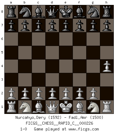 Last move : 1-0 2019 December 22 12:0:26 [Event "FICGS__CHESS__RAPID_C__000226"] [Site "FICGS"] [Date "2019.11.21"] [Round "1"] [White "Nurcahyo,Dery"] [Black "Fadl,Amr"] [Result "1-0"] [WhiteElo "1592"] [BlackElo "1500"] 1.h4 1-0 This chess game has been lost on time (started : 2019.11.21 21:9:25) Anti-Borg (Desprez) Opening Player White won this chess game. Follow this game move after move (download)Robert Fischer is a law unto himself. (Larry Evans) Ein bischen Romantik kann weder im Schach noch in der Liebe schaden. Also versuche ich mich ab und zu daran zu erinnern. (Nigel Short) Durante una competencia de Ajedrez, un Maestro de Ajedrez deberá ser una combinación de presa de caza y un Monge. (Alexander Alekhine) Si je n'étais pas joueur d'échecs, je serais le meilleur dans quelque chose d'autre. (Anatoli Karpov) Perseverance does not equal worthiness. Next time you want to get my attention, wear something fun. Low-riding jeans are hot. (Gregory House, House M.D.)