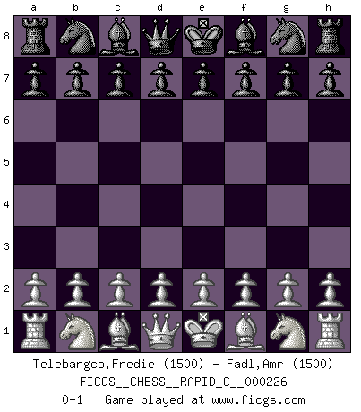 Last move : 0-1 2019 December 22 12:0:26 [Event "FICGS__CHESS__RAPID_C__000226"] [Site "FICGS"] [Date "2019.11.21"] [Round "1"] [White "Telebangco,Fredie"] [Black "Fadl,Amr"] [Result "0-1"] [WhiteElo "1500"] [BlackElo "1500"] 0-1 This chess game has been lost on time (started : 2019.11.21 21:9:25) Player Black won this chess game. Follow this game move after move (download)If Chess is a science, it's a most inexact one. If Chess is an art, it is too exacting to be seen as one. If Chess is a sport, it's too esoteric. If Chess is a game, it's too demanding to be just a game. If Chess is a mistress, she's a demanding one. If Chess is a passion, it's a rewarding one. If Chess is life, it's a sad one. (Unknown) Der Freibauer hat für mich eine Seele, genau wie der Mensch, Wünsche, die unerkannt in ihm schlummern, und Befürchtungen, von deren Existenz er selbst kaum ahnt. (Aaron Nimzowitsch) El jugador táctico debe saber que hacer cuando algo se debe de hacer. El estratégico debe saber que hacer cuando nada se debe de hacer. (Savielly Tartakover) On est toujours la mazette de quelqu'un d'autre. (Anonyme) Luck is what you have left over after you give 100 percent. (Langston Coleman)