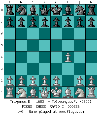 Last move : 1-0 2019 December 27 23:31:20 [Event "FICGS__CHESS__RAPID_C__000226"] [Site "FICGS"] [Date "2019.11.21"] [Round "1"] [White "Trigance,Emile"] [Black "Telebangco,Fredie"] [Result "1-0"] [WhiteElo "1683"] [BlackElo "1500"] 1.f4 1-0 This chess game has been lost on time (started : 2019.11.21 21:9:25) Bird's Opening Player White won this chess game. Follow this game move after move (download)Best by test: 1. e4 (Bobby Fischer) Oft bringt ein stiller Zug das Erdbeben. (Richard Reti) La belleza de un movimiento no se refleja solo en su apariencia, sino en el pensamiento detrás de él. (Siegbert Tarrasch) Les Echecs sont et restent toujours un combat, un combat intégral comme la boxe, la lutte ou un autre sport, et où il doit y avoir un vainqueur et un vaincu. (Joseph Emil Diemer) Inventor: A person who makes an ingenious arrangement of wheels, levers and springs, and believes it civilization. (Ambrose Bierce, The Devil's Dictionary)