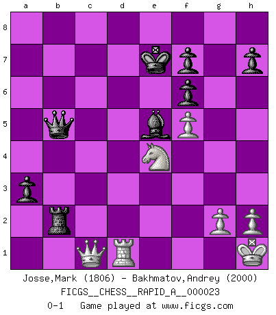 Last move : 0-1 2007 September 10 12:1:29 [Event "FICGS__CHESS__RAPID_A__000023"] [Site "FICGS"] [Date "2007.06.30"] [Round "1"] [White "Josse,Mark"] [Black "Bakhmatov,Andrey"] [Result "0-1"] [WhiteElo "1806"] [BlackElo "2000"] 1.e4 e5 2.Nf3 d6 3.Bc4 Be7 4.O-O Nf6 5.d3 O-O 6.Re1 c6 7.Bb3 Re8 8.c3 Bf8 9.Bg5 Nbd7 10.Nbd2 Nc5 11.Bc2 Ne6 12.Bh4 Nf4 13.d4 Qc7 14.Bxf6 gxf6 15.Nh4 d5 16.Nf5 Bxf5 17.exf5 exd4 18.cxd4 c5 19.Re3 Bh6 20.dxc5 Rxe3 21.fxe3 Qxc5 22.Nf1 d4 23.b4 Qb6 24.exf4 d3 25.Kh1 dxc2 26.Qxc2 Bxf4 27.Qe4 Qf2 28.Qxb7 Rb8 29.Qe4 Be5 30.Rd1 Qxa2 31.Qg4+ Kf8 32.Qh5 Rxb4 33.Qh6+ Ke7 34.Qe3 Qa5 35.Qf3 Qb5 36.Qe3 a5 37.Qc1 a4 38.Ng3 Rb2 39.Ne4 a3 0-1 Philidor's defense Kingside Castling by player White (move 4) Kingside Castling by player Black (move 5) Player Black won this chess game. Follow this game move after move (download)If you aren't afraid of Spassky, then I have removed the element of money. (Jim Slater) Wenn Du einsam bist, wenn Du Dich in der Welt wie ein Fremder fühlst, spiele Schach. Das wird Deinen Geist erheben und Dein Ratgeber im Kampf sein. (Aristoteles) La pasion por jugar al Ajedrez es una de las mas inexplicables en el mundo. (H.G. Wells) Les échecs sont plus proches de l'art de l'assassinat que de l'art de la guerre. (Arturo Perez-Reverte) Wawaweewa ! (Borat: Cultural learnings of America for make benefit glorious nation of Kazakhstan)