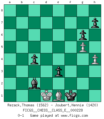 Last move : 0-1 2020 February 7 16:10:53 [Event "FICGS__CHESS__CLASS_E__000228"] [Site "FICGS"] [Date "2019.11.24"] [Round "1"] [White "Rezack,Thomas"] [Black "Joubert,Hennie"] [Result "0-1"] [WhiteElo "1562"] [BlackElo "1420"] 1.e4 c5 2.Nf3 e6 3.d4 cxd4 4.Nxd4 Nf6 5.Nc3 Qb6 6.e5 Bc5 7.Ncb5 Nd5 8.c3 a6 9.Nd6+ Bxd6 10.exd6 Qxd6 11.Bc4 Nf6 12.O-O Nc6 13.Nxc6 Qxd1 14.Rxd1 bxc6 15.Bf4 d5 16.Bb3 Bb7 17.Rd2 Ke7 18.c4 Rab8 19.c5 Ne4 20.Re2 Rbd8 21.Rae1 Nxc5 22.Bc2 Nd7 23.Bf5 Rhe8 24.Bg4 Kf8 25.b4 Nf6 26.Bf3 a5 27.bxa5 c5 28.Rb1 Ba6 29.Reb2 Bd3 30.Rc1 c4 31.Bc7 Ra8 32.Bd6+ Kg8 33.Bc7 Ra6 34.Bd1 Ne4 35.Bb6 Rb8 36.f3 Nf6 37.Kf2 Rxa5 38.Bxa5 Rxb2+ 39.Kg1 Rxa2 40.Bc3 Nd7 41.Bd4 e5 42.Bc3 d4 43.Bb4 Nb6 44.Bd6 f6 45.Bc5 Nd5 46.h3 Nc3 47.f4 Nxd1 48.Rxd1 Rb2 49.fxe5 fxe5 50.Bd6 e4 51.Be5 Rb1 52.Rxb1 Bxb1 53.Bxd4 Kf7 54.Kf2 Ke6 55.Ke3 g6 56.g4 Kd5 57.h4 Bc2 58.g5 Ke6 59.Kd2 Bd3 60.Kc3 Kf5 61.Bf2 Kf4 62.Kd2 Kf3 63.Be1 e3+ 64.Kd1 Kg2 65.Kc1 Kf1 66.Kd1 Bc2+ 0-1 Sicilian : Anderssen variation Kingside Castling by player White (move 12) 10 pieces endgame at move 53 : White KBPP , Black KBPPPP WHITE : King + 1 Bishop 2 Pawns BLACK : King + 1 Bishop 4 Pawns Player Black won this chess game. Follow this game move after move (download)I am still a victim of Chess. It has all the beauty of art and much more. It cannot be commercialized. Chess is much purer than art in its social position. (Marcel Duchamp) Ich verachte Kasparow. (Viktor Kortschnoi) Bobby es la celebridad menos entendida y malinterpretada que camina el la faz de esta tierra. (Yasser Seirawan) Si je n'étais pas joueur d'échecs, je serais le meilleur dans quelque chose d'autre. (Anatoli Karpov) God, you are such an idiot. - Actually, I thought I was more of a jerk. (Gregory House to Stacy Warner, House M.D.)