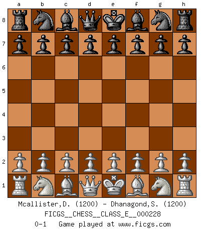 Last move : 0-1 2020 January 3 18:39:56 [Event "FICGS__CHESS__CLASS_E__000228"] [Site "FICGS"] [Date "2019.11.24"] [Round "1"] [White "Mcallister,David"] [Black "Dhanagond,Shiva"] [Result "0-1"] [WhiteElo "1200"] [BlackElo "1200"] 0-1 This chess game has been lost on time (started : 2019.11.24 12:23:2) Player Black won this chess game. Follow this game move after move (download)Castle early and often. (Rob Sillars) Ivan Sokolov treibt mich als Beifahrer an mit go Loeky go - . (Loek van Wely) El muchacho (en ese entonces un niño de 12 años llamado Anatoly Karpov) no tiene ni idea de lo que es el Ajedrez y no hay futuro en absoluto para el en esta profesión. (Mikhail Botvinnik) C'est la seule position que je connaisse où les deux camps sont mals. Propos prêtés à V. Anand. Success without honor is an unseasoned dish; it will satisfy your hunger, but it won't taste good. (Joe Paterno)