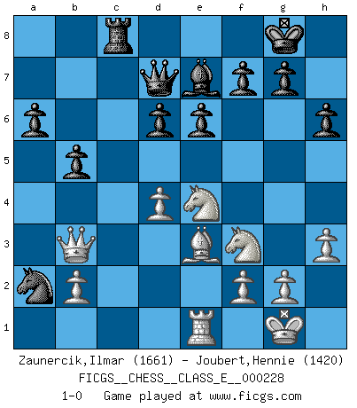 Last move : 1-0 2019 December 5 10:37:52 [Event "FICGS__CHESS__CLASS_E__000228"] [Site "FICGS"] [Date "2019.11.24"] [Round "1"] [White "Zaunercik,Ilmar"] [Black "Joubert,Hennie"] [Result "1-0"] [WhiteElo "1661"] [BlackElo "1420"] 1.e4 c5 2.Nf3 e6 3.c3 Nf6 4.d3 d6 5.Be2 a6 6.O-O Qc7 7.Nbd2 Be7 8.Re1 Nc6 9.Nf1 b5 10.Ng3 Bb7 11.d4 cxd4 12.cxd4 O-O 13.Bg5 h6 14.Be3 Rac8 15.Rc1 Qd7 16.Bd3 Rfd8 17.h3 Nb4 18.Bb1 Nxe4 19.Bxe4 Bxe4 20.Nxe4 Nxa2 21.Rxc8 Rxc8 22.Qb3 1-0 Sicilian defense Kingside Castling by player White (move 6) Kingside Castling by player Black (move 12) Player White won this chess game. Follow this game move after move (download)Botvinnik tried to take the mystery out of Chess, always relating it to situations in ordinary life. He used to call Chess a typical inexact problem similar to those which people are always having to solve in everyday life. (Garry Kasparov) Ein Schachgenie ist jemand der verdammt gut Schach spielt. (Jonathan Levitt) Siempre es mejor sacrificar los hombres de tu oponente. (Savielly Tartakower) Pour moi, les échecs ne sont pas un jeu mais un art. (Alexandre Alekhine) Wisdom doesn't necessarily come with age. Sometimes age just shows up all by itself. (Tom Wilson)
