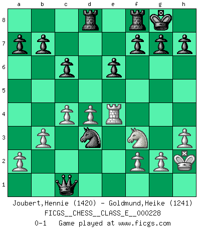 Last move : 0-1 2019 December 19 15:52:15 [Event "FICGS__CHESS__CLASS_E__000228"] [Site "FICGS"] [Date "2019.11.24"] [Round "1"] [White "Joubert,Hennie"] [Black "Goldmund,Heike"] [Result "0-1"] [WhiteElo "1420"] [BlackElo "1241"] 1.e4 d5 2.exd5 Qxd5 3.Nc3 Qa5 4.d4 Nf6 5.Nf3 Bg4 6.Be2 c6 7.O-O e6 8.Bd2 Qc7 9.h3 Bf5 10.Rc1 Bd6 11.Bg5 Nbd7 12.Bd3 Bxd3 13.Qxd3 O-O 14.Ne4 Bf4 15.Nxf6+ Nxf6 16.Bxf4 Qxf4 17.Rfe1 Nd5 18.Re4 Qxc1+ 19.Kh2 Rad8 20.b3 Nb4 21.c4 Nxd3 0-1 Scandinavian (centre counter) defense Kingside Castling by player White (move 7) Kingside Castling by player Black (move 13) Player Black won this chess game. Follow this game move after move (download)Chess is everything: art, science and sport. (Anatoly Karpov) Korrekt heißt in Deutschland die Haltung eines Mannes, dessen Benehmen nach dem Urteile seiner Nachbarn seiner Stellung angemessen ist. Um korrekt zu sein, muß man sich der Meinung der anderen anpassen... (Emanuel Lasker) Los tropiezos estan todos ahí en el tablero, esperando que se cometan. (Savielly Tartakover) J'ai vu le vaincu d'Echecs jouer des années durant dans l'espoir de la fête de la victoire. Car tu es plus riche de ce qu'elle existe si même elle n'est point pour toi. Ainsi de la perle du fond des mers. (Antoine de Saint-Exupéry) If I had no sense of humor, I would long ago have committed suicide. (Mahatma Gandhi)