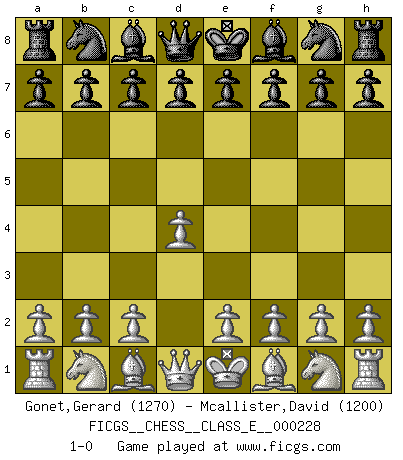 Last move : 1-0 2020 January 3 18:39:56 [Event "FICGS__CHESS__CLASS_E__000228"] [Site "FICGS"] [Date "2019.11.24"] [Round "1"] [White "Gonet,Gerard"] [Black "Mcallister,David"] [Result "1-0"] [WhiteElo "1270"] [BlackElo "1200"] 1.d4 1-0 This chess game has been lost on time (started : 2019.11.24 12:23:2) Queen's pawn Player White won this chess game. Follow this game move after move (download)Live, lose, and learn, by observing your opponent how to win. (Amber Steenbock) Schach ist mein Leben, meine Leidenschaft, was ich gelernt habe und seit meinem 14. Lebensjahr profimässig praktiziere. Darauf zu verzichten, würde mir sehr schwer fallen. (Viktor Kortschnoi) Nos gusta pensar. (Gary Kasparov) A ce moment-là, je menaçais de comprendre la position ! (Clément L'Heureux) A government big enough to give you everything you want is strong enough to take everything you have. (Thomas Jefferson)