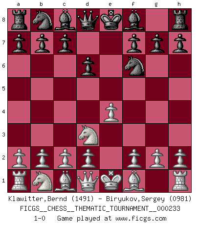 Last move : 1-0 2020 January 3 18:39:56 [Event "FICGS__CHESS__THEMATIC_TOURNAMENT__000233"] [Site "FICGS"] [Date "2019.11.24"] [Round "1"] [White "Klawitter,Bernd"] [Black "Biryukov,Sergey"] [Result "1-0"] [WhiteElo "1491"] [BlackElo "0981"] 1.e4 e5 2.Nf3 Nf6 3.Nxe5 d6 4.Nd3 1-0 This chess game has been lost on time (started : 2019.11.24 12:24:22) Petrov's defense Player White won this chess game. Follow this game move after move (download)I prefer to lose a really good game than to win a bad one. (David Levy) Moralische Siege zählen nicht. (Savielly Grigorievitsch Tartakower) El hombre es un frívolo, una creatura engañosa y como un jugador de Ajedrez, se preocupa mas por el proceso de obtener su meta que de la meta por sí misma. (Dostoyevsky) Les ravages du H expliquent la différence de niveau entre Tal et Thal [Abergel]. I teach you to lie, cheat and steal, and as soon as my back's turned you wait in line ? (Gregory House, House M.D.)