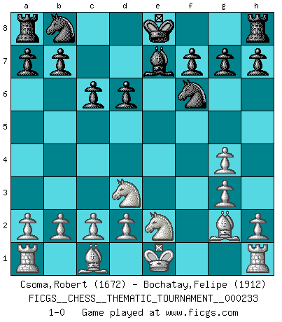 Last move : 1-0 2020 February 22 16:40:51 [Event "FICGS__CHESS__THEMATIC_TOURNAMENT__000233"] [Site "FICGS"] [Date "2019.11.24"] [Round "1"] [White "Csoma,Robert"] [Black "Bochatay,Felipe"] [Result "1-0"] [WhiteElo "1672"] [BlackElo "1912"] 1.e4 e5 2.Nf3 Nf6 3.Nxe5 d6 4.Nd3 Nxe4 5.Qe2 Qe7 6.g3 Nf6 7.Nc3 c6 8.Bg2 Bg4 9.f3 Qxe2+ 10.Nxe2 Be7 11.fxg4 1-0 This chess game has been lost on time (started : 2019.11.24 12:24:22) Petrov's defense Player White won this chess game. Follow this game move after move (download)Every Pawn is a potential Queen. (James Mason) Schach sollte überall auf der Welt Schulfach werden. Es fördert die geistige Auseinandersetzung. Es lehrt die Demut in der Niederlage. (Garry Kasparov) Con el fin de mejorar tu juego, debes de estudiar los finales antes que todo, ya que mientras que los finales pueden ser estudiados y dominados por sí mismos, el juegomedio y la apertura deben de ser estudiados en relación con los finales. (José Raúl Capablanca) C'est la seule position que je connaisse où les deux camps sont mals. Propos prêtés à V. Anand. To steal ideas from one person is plagiarism. To steal from many is research. (Unknown)
