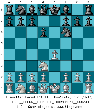 Last move : 1-0 2020 January 3 18:39:56 [Event "FICGS__CHESS__THEMATIC_TOURNAMENT__000233"] [Site "FICGS"] [Date "2019.11.24"] [Round "1"] [White "Klawitter,Bernd"] [Black "Bautista,Eric"] [Result "1-0"] [WhiteElo "1491"] [BlackElo "1687"] 1.e4 e5 2.Nf3 Nf6 3.Nxe5 d6 4.Nd3 1-0 This chess game has been lost on time (started : 2019.11.24 12:24:22) Petrov's defense Player White won this chess game. Follow this game move after move (download)My God, Bobby Fischer plays so simply. (Alexei Suetin) Ich hatte meine größten Erfolge, als ich 47 Jahre alt war. Kasparow war noch nicht mal 42 und hat das Schach schon im Stich gelassen. (Viktor Kortschnoi) No existe un remordimiento como el remordimiento del Ajedrez. (H. G. Wells) Les Echecs, c'est l'art de la guerre sans les charniers, c'est la résurrection des morts tombés au champ d'honneur, l'espoir perpétuel, la suprématie de l'intelligence sur la force, la culture de l'esprit. (F. Szpiner) They say poker is a zero-sum game. It must be, because every time I play my sum ends up zero. (Max Shapiro)