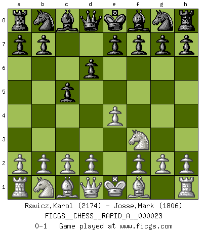 Last move : 0-1 2007 August 1 7:45:4 [Event "FICGS__CHESS__RAPID_A__000023"] [Site "FICGS"] [Date "2007.06.30"] [Round "1"] [White "Rawicz,Karol"] [Black "Josse,Mark"] [Result "0-1"] [WhiteElo "2174"] [BlackElo "1806"] 1.e4 c5 2.Nf3 d6 0-1 This chess game has been lost on time (started : 2007.06.30 1:4:17) Sicilian Player Black won this chess game. Follow this game move after move (download)In Chess, as it is played by masters, chance is practically eliminated. (Emanuel Lasker) In Buenos Aires ist es nicht mein vorrangiges Ziel ein starkes Turnier zu organisieren, sondern ein Turnier für Gentlemen. Ich würde nie Kamsky einladen. Ich mag keine Probleme. (Miguel Najdorf) La maestría del Ajedrez consiste esencialmente en analizar posiciónes de Ajedrez con precisión. (Mikhail Botvinnik) Aux échecs, l'amour-propre est satisfait quand on remporte la victoire, mais il n'y a pas de honte à être battu. (Benjamin Franklin) Wisdom begins at the end. (Daniel Webster)