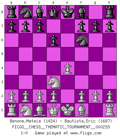 Last move : 1-0 2020 January 3 18:39:56 [Event "FICGS__CHESS__THEMATIC_TOURNAMENT__000233"] [Site "FICGS"] [Date "2019.11.24"] [Round "1"] [White "Benone,Mateia"] [Black "Bautista,Eric"] [Result "1-0"] [WhiteElo "1424"] [BlackElo "1687"] 1.e4 e5 2.Nf3 Nf6 3.Nxe5 d6 4.Nd3 1-0 This chess game has been lost on time (started : 2019.11.24 12:24:22) Petrov's defense Player White won this chess game. Follow this game move after move (download)Let the perfectionist play postal. (Yasser Seirawan) Ich habe die Schachforschung dermaßen betrieben, dass sie auf eine wissenschaftliche Basis gestellt wurde. (Mikhail Moiseyevich Botvinik) Desconfianza es la característica mas necesaria de un jugador de Ajedrez. (Siegbert Tarrasch) L'action d'une oeuvre littéraire se déroule sur un champ de bataille. Les masques et les types du drame moderne correspondent aux pièces du jeu d'échecs. L'intrigue correspond aux coups et aux gambits, c'est à dire aux techniques du jeu telles qu'utilisées et interprétées par les joueurs. Les tactiques et les péripéties [mouvements] correspondent aux coups exécutés par l'adversaire. (Viktor Shklovsky) When it is a question of money, everybody is of the same religion. (Voltaire)