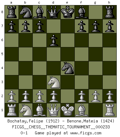 Last move : 0-1 2020 February 1 4:27:23 [Event "FICGS__CHESS__THEMATIC_TOURNAMENT__000233"] [Site "FICGS"] [Date "2019.11.24"] [Round "1"] [White "Bochatay,Felipe"] [Black "Benone,Mateia"] [Result "0-1"] [WhiteElo "1912"] [BlackElo "1424"] 1.e4 e5 2.Nf3 Nf6 3.Nxe5 d6 4.Nd3 Nxe4 0-1 This chess game has been lost on time (started : 2019.11.24 12:24:22) Petrov's defense Player Black won this chess game. Follow this game move after move (download)Bobby just drops the pieces and they fall on the right squares. (Miguel Najdorf) Je mehr wir mit Computern analysieren, desto mehr glauben wir an Verteidigung. (Vladimir Kramnik) Las leyes del Ajedrez no permiten una libre elección: tienes que mover quieras o no. (Emanuel Lasker) Les erreurs sont comme les malheurs, elles n'arrivent jamais seules. (Siegbert Tarrasch) The problem with troubleshooting is that trouble shoots back. (Anonymous)