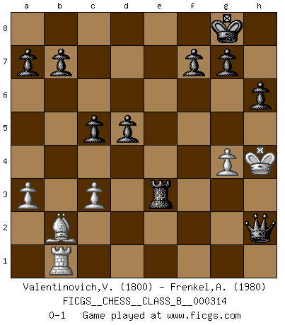 Last move : 0-1 2020 February 12 22:30:5 [Event "FICGS__CHESS__CLASS_B__000314"] [Site "FICGS"] [Date "2019.11.25"] [Round "1"] [White "Valentinovich,Vladimir"] [Black "Frenkel,Alex"] [Result "0-1"] [WhiteElo "1800"] [BlackElo "1980"] 1.e4 e5 2.Nf3 Nc6 3.Nc3 Nf6 4.d4 exd4 5.Nxd4 Bb4 6.a3 Bxc3+ 7.bxc3 Nxe4 8.Qf3 O-O 9.Bd3 Nxc3 10.O-O Nxd4 11.Qe3 c5 12.Bb2 Re8 13.Qh3 Nce2+ 14.Kh1 h6 15.c3 d5 16.Qh5 Nf4 17.Qd1 Qg5 18.g3 Nxd3 19.Qxd3 Bf5 20.Qd1 Be4+ 21.f3 Nxf3 22.Rxf3 Qh5 23.Kg2 Bxf3+ 24.Qxf3 Re2+ 25.Qxe2 Qxe2+ 26.Kh3 Re8 27.Rb1 Re5 28.g4 Re3+ 29.Kh4 Qxh2+ 0-1 Four knights : Scotch, 4...exd4 Kingside Castling by player Black (move 8) Kingside Castling by player White (move 10) Player Black won this chess game. Follow this game move after move (download)It is no time to be playing Chess when the house is on fire. (Italian Proverb) Karpov ist ein Museumsstück. (Garry Kasparov) Desconfianza es la característica mas necesaria de un jugador de Ajedrez. (Siegbert Tarrasch) Les Echecs, c'est l'art de la guerre sans les charniers, c'est la résurrection des morts tombés au champ d'honneur, l'espoir perpétuel, la suprématie de l'intelligence sur la force, la culture de l'esprit. (F. Szpiner) Bobby never cared about money, though. His only desire was to prove that his choices were correct: He wanted chess to be important because he was a chess player, and he wanted to be important. Bobby knew money was important, but he didn't have a clue why, outside of clothes and status. The only way he could accomplish what he wanted was to fight for a lot of money. Once he got it, he gave it away. He did not know how to spend it. And once he'd become champion, after, essentially, sacrificing his life for it, he didn't know how to spend his time. (Bob Wade)