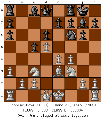 Last move : 0-1 2006 November 8 9:40:16 [Event "FICGS__CHESS__CLASS_B__000004"] [Site "FICGS"] [Date "2006.06.19"] [Round "1"] [White "Grobler,Dave"] [Black "Bonoldi,Fabio"] [Result "0-1"] [WhiteElo "1993"] [BlackElo "1963"] 1.e4 d6 2.d4 Nf6 3.Nc3 g6 4.f4 Bg7 5.Nf3 O-O 6.Bd3 Nc6 7.d5 Nb4 8.Be2 c6 9.a3 Na6 10.Bxa6 bxa6 11.Be3 c5 0-1 This chess game has been lost on time (started : 2006.06.19 20:18:36) Pirc : Austrian attack, 6.Bd3 Kingside Castling by player Black (move 5) Player Black won this chess game. Follow this game move after move (download)All my games are real. (Bobby Fischer) Darum geht es im Schach. Einen Tag gibst du deinem Gegner eine Lektion, am nächsten Tag gibt er dir eine. (Robert James Fischer) Creo que una cierta cantidad de temperamento es esperada de los genios del Ajedrez. (Ron Gross) On entre au jeu d'Echecs comme on entre en Religion. Pour le joueur d'Echecs, la partie d'Echecs c'est l'office, la messe, le défilé du 1er Mai, le dépôt de gerbe au Monument aux Morts. C'est un drame sacré. (Michel Roos) All politicians must be presumed guilty until they are proven innocent. (Dinesh De Silva)