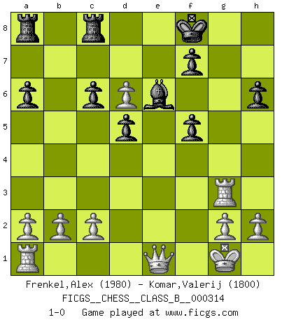 Last move : 1-0 2020 January 15 16:58:5 [Event "FICGS__CHESS__CLASS_B__000314"] [Site "FICGS"] [Date "2019.11.25"] [Round "1"] [White "Frenkel,Alex"] [Black "Komar,Valerij"] [Result "1-0"] [WhiteElo "1980"] [BlackElo "1800"] 1.e4 e5 2.Nf3 Nc6 3.Bb5 a6 4.Ba4 Nf6 5.O-O Nxe4 6.d4 Be7 7.Re1 b5 8.Rxe4 d5 9.Nxe5 Nxe5 10.Rxe5 bxa4 11.Nc3 c6 12.Qe1 Be6 13.f4 g6 14.Nxa4 O-O 15.f5 gxf5 16.Nc5 Bxc5 17.dxc5 Qf6 18.Bf4 h6 19.Re3 Rfc8 20.Be5 Qe7 21.Rg3+ Kf8 22.Bd6 Qxd6 23.cxd6 1-0 Ruy Lopez : Open, 6.d4 Kingside Castling by player White (move 5) Kingside Castling by player Black (move 14) Player White won this chess game. Follow this game move after move (download)My opponents make good moves too. Sometimes I don't take these things into consideration. (Bobby Fischer) Mit sehr nachdenklichem Gesicht schreitet Bobby durch den Turniersaal. Was ist passiert?, fragt Lombardy. Ich stehe schlecht, antwortet Fischer. Lombardy: Dann biete doch einfach Remis an. Fischer: So schlecht stehe ich nun auch wieder nicht! (Robert James Fischer) Tu sabes que vas a perder. Aún cuando tenía la ventaja, yo sabía que iba a perder. - al estar jugando con Fischer (Andrew Soltis) Le jeu d'échecs fait naître et fortifie en nous plusieurs qualités précieuses dans le cours de l'existence, telles que la prévoyance, la circonspection, la prudence, et la persévérance. (Benjamin Franklin - 1783, la morale des échecs) What doesn't kill us makes us stronger. (Friedrich Nietzsche)