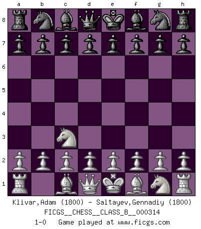 Last move : 1-0 2020 January 24 22:35:45 [Event "FICGS__CHESS__CLASS_B__000314"] [Site "FICGS"] [Date "2019.11.25"] [Round "1"] [White "Klivar,Adam"] [Black "Saltayev,Gennadiy"] [Result "1-0"] [WhiteElo "1800"] [BlackElo "1800"] 1.Nc3 1-0 This chess game has been lost on time (started : 2019.11.25 2:36:48) Dunst (Sleipner, Heinrichsen) Opening Player White won this chess game. Follow this game move after move (download)When asked, -How is that you pick better moves than your opponents?, I responded: I'm very glad you asked me that, because, as it happens, there is a very simple answer. I think up my own moves, and I make my opponent think up his. (Alexander Alekhine) Ich kenne keine einzige Person, die behaupten würde, Garri Kasparow sei ein guter Mensch (Nigel Short) Los errores estan ahí, esperando a que se cometan. (Savielly Tartakower) Le joueur d'Echecs qui veut atteindre le top est obligé de développer son propre credo créatif. Alexeï Stepanovicth Souétine. Il est facile d'écrire des livres ! Ce qui est difficile, c'est de jouer ! (Alexeï Stepanovicth Souétine) Wawaweewa ! (Borat: Cultural learnings of America for make benefit glorious nation of Kazakhstan)